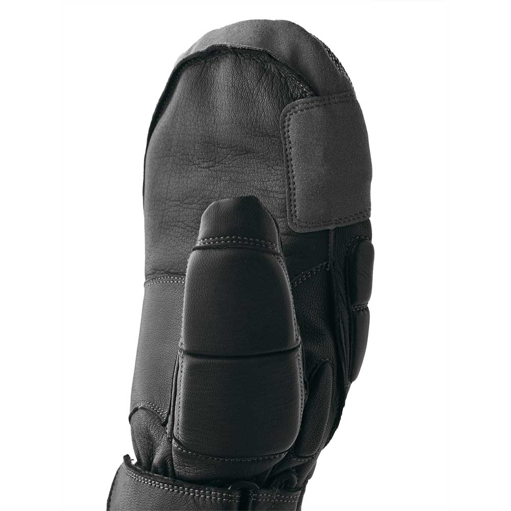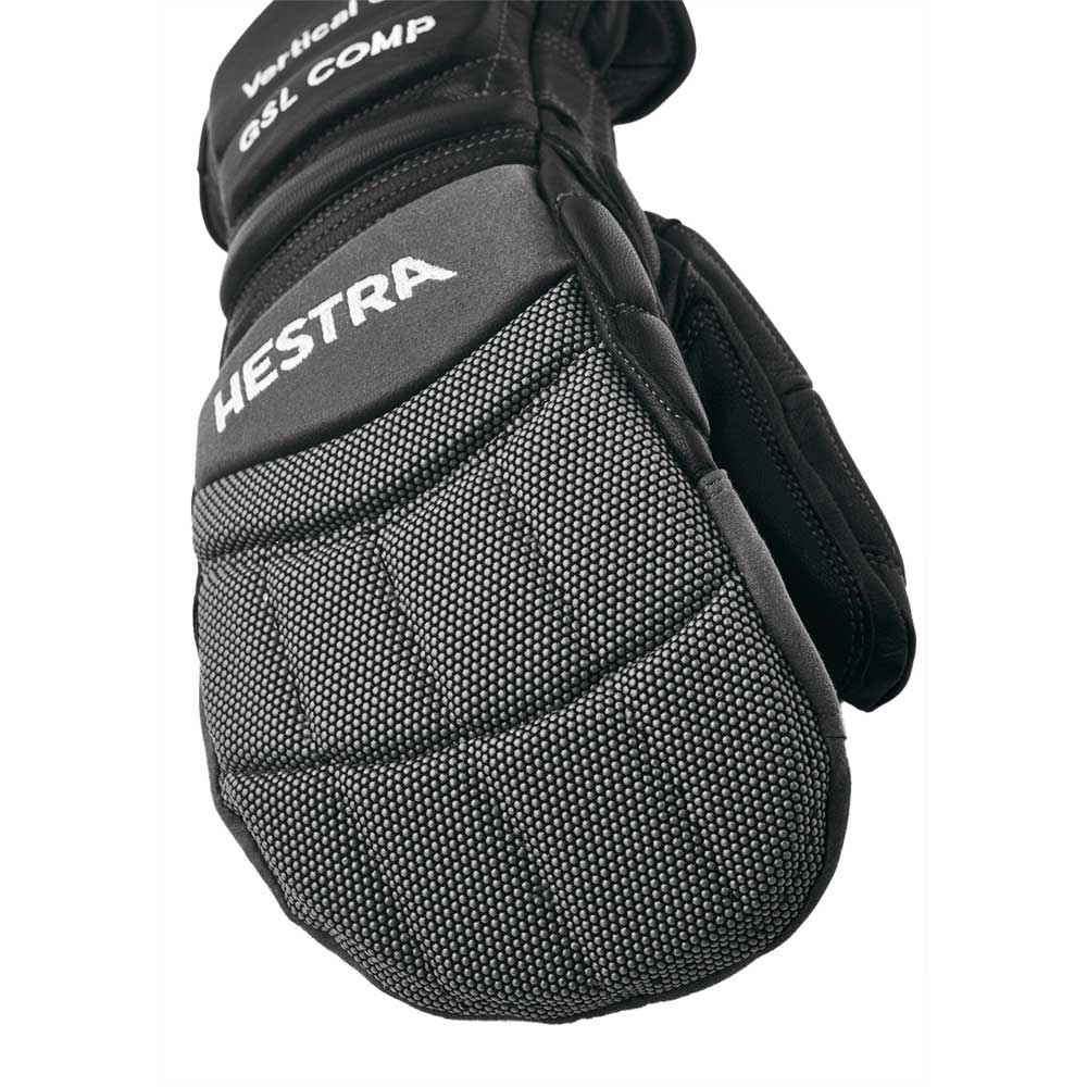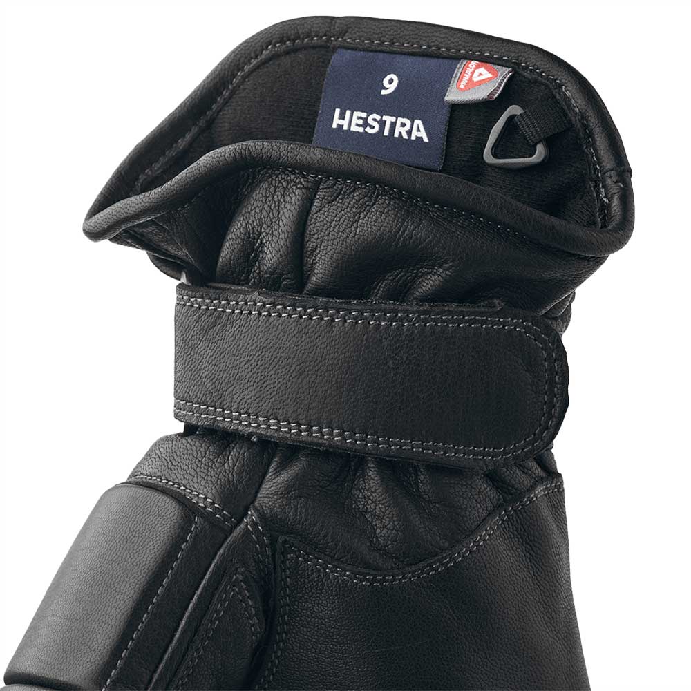 スウェーデンアルペンチーム所属の高速系選手と共同開発したレーシンググローブです。GSやスーパーGなど高速系種目では、深く体を倒し込んだ高速ターン時に、ポールを握るターン内側の手が氷化した固い雪面と接触します。そこで、雪面に当たる指の付け根から指先までの外側をセラミック繊維で保護しました。これにより雪面との摩擦係数が軽減され、なおかつ耐久性がアップしています。23-24シーズンのニューモデルですが、ベースになっているのは、定評あるHESTRAレーシンググローブで、甲と親指外側、ベルクロ留めの手首外側にはパッド入りです。手のひらは耐久性に優れたゴート(山羊)皮革を使用し、手の自然な形に添うような立体裁断を採用。内側のライナーは指が5本に分かれており、保温性の高い「プリマロフトゴールド」の中綿入りです。このミトングローブの他に、5フィンガー、3フィンガーと3モデルが揃います。