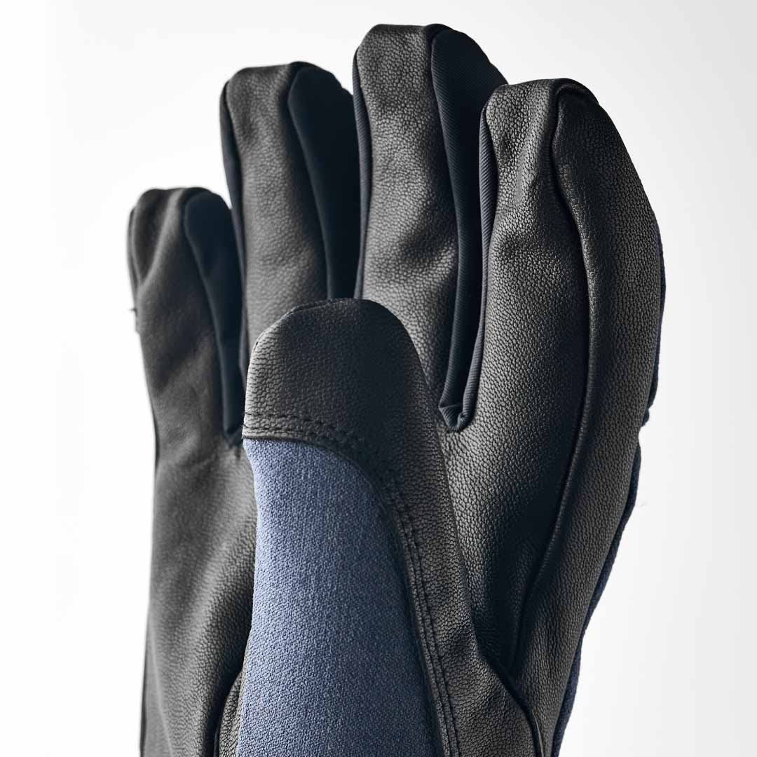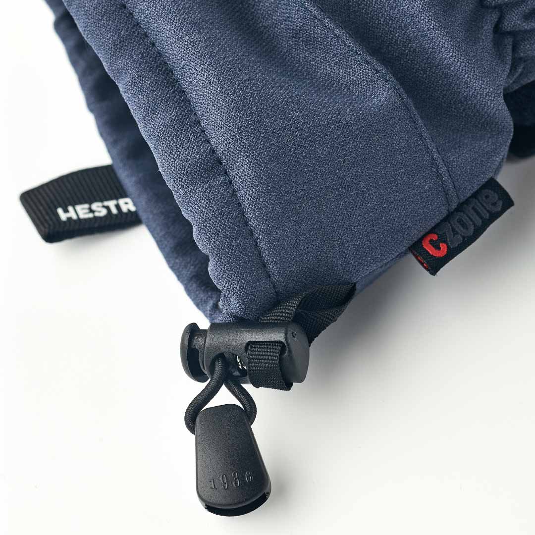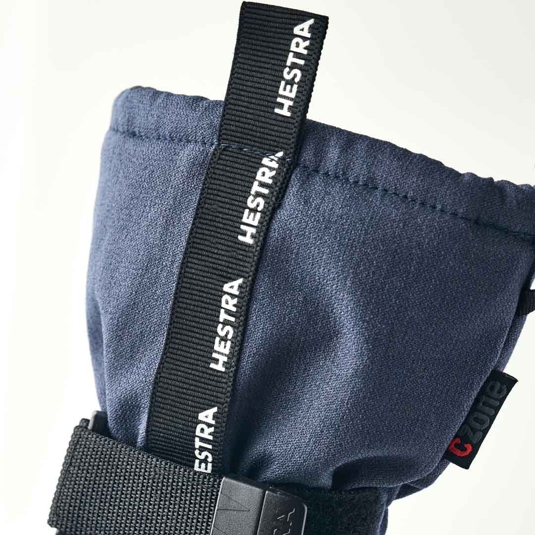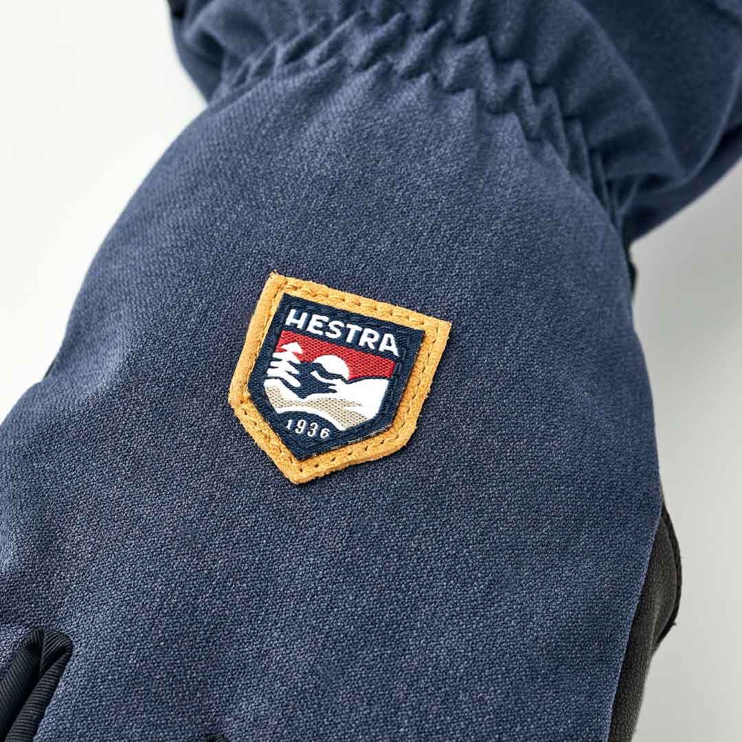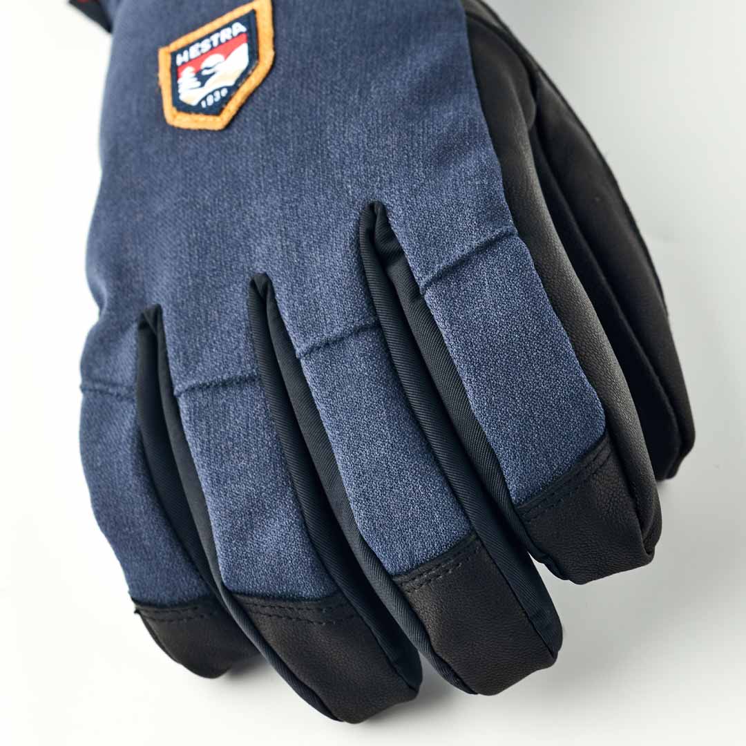 パウダーライディングに最適なHESTRAの人気定番「Heli Ski」シリーズと共通するスタイルを持つライトウェイト5フィンガーモデルです。手のひらはポールをしっかりグリップするゴートレザー(山羊革)で、カフから甲、指の外側はポリエステルファブリックで軽さと柔軟性を求め、防水透湿性メンブレンCZoneをインサートして防水性を持たせています。長めのカフとドローコードのスノーロックが、滑走中の粉雪の浸入を遮断します。ポリエステル製のライナーは取り外しのできない固定式。カフの長い「Heli Ski」のようなスタイルを気軽に使いたいという方に最適で、装着感もよりやわらかです。レザー部が少ないぶん、メンテナンスにも手間がかかりません。