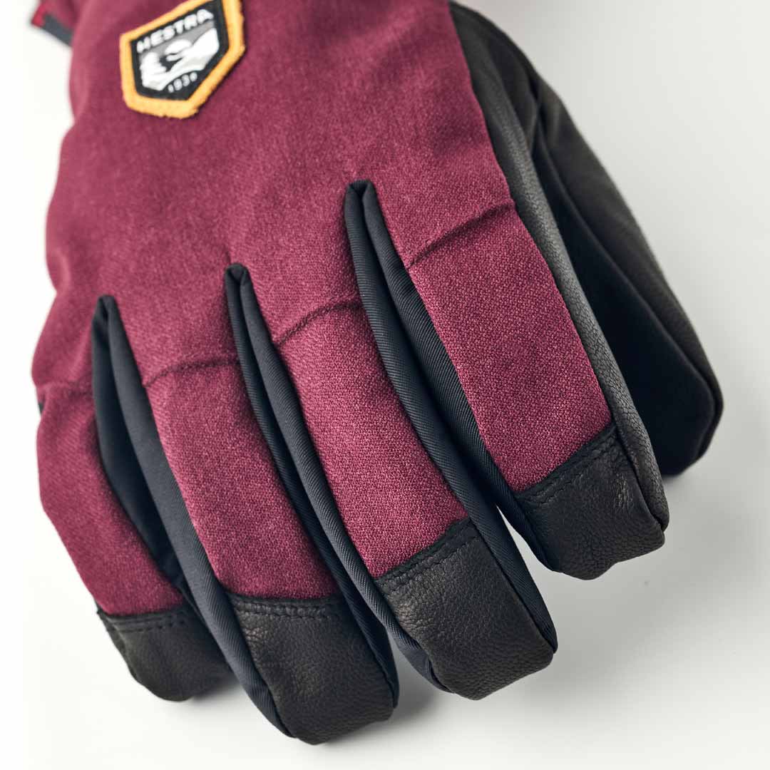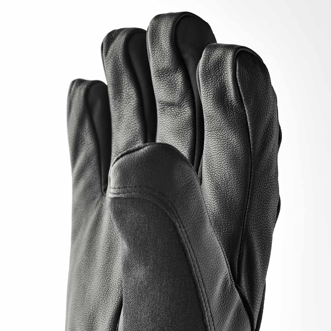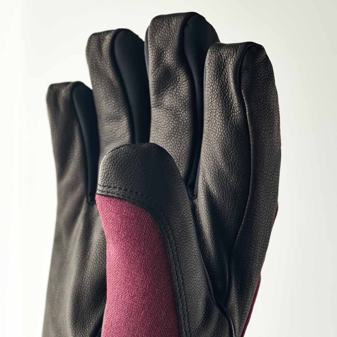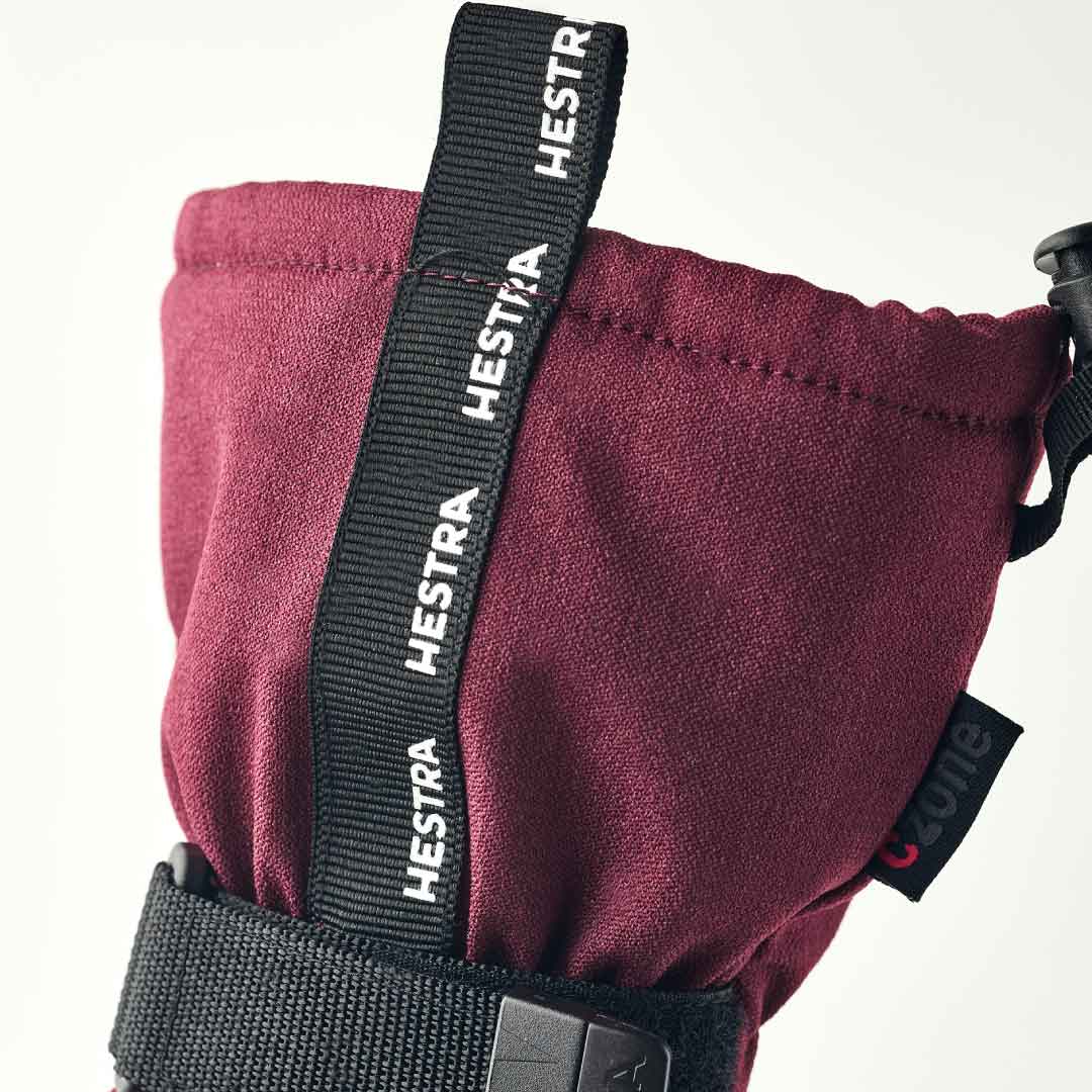 パウダーライディングに最適なHESTRAの人気定番「Heli Ski」シリーズと共通するスタイルを持つライトウェイト5フィンガーモデルです。手のひらはポールをしっかりグリップするゴートレザー(山羊革)で、カフから甲、指の外側はポリエステルファブリックで軽さと柔軟性を求め、防水透湿性メンブレンCZoneをインサートして防水性を持たせています。長めのカフとドローコードのスノーロックが、滑走中の粉雪の浸入を遮断します。ポリエステル製のライナーは取り外しのできない固定式。カフの長い「Heli Ski」のようなスタイルを気軽に使いたいという方に最適で、装着感もよりやわらかです。レザー部が少ないぶん、メンテナンスにも手間がかかりません。