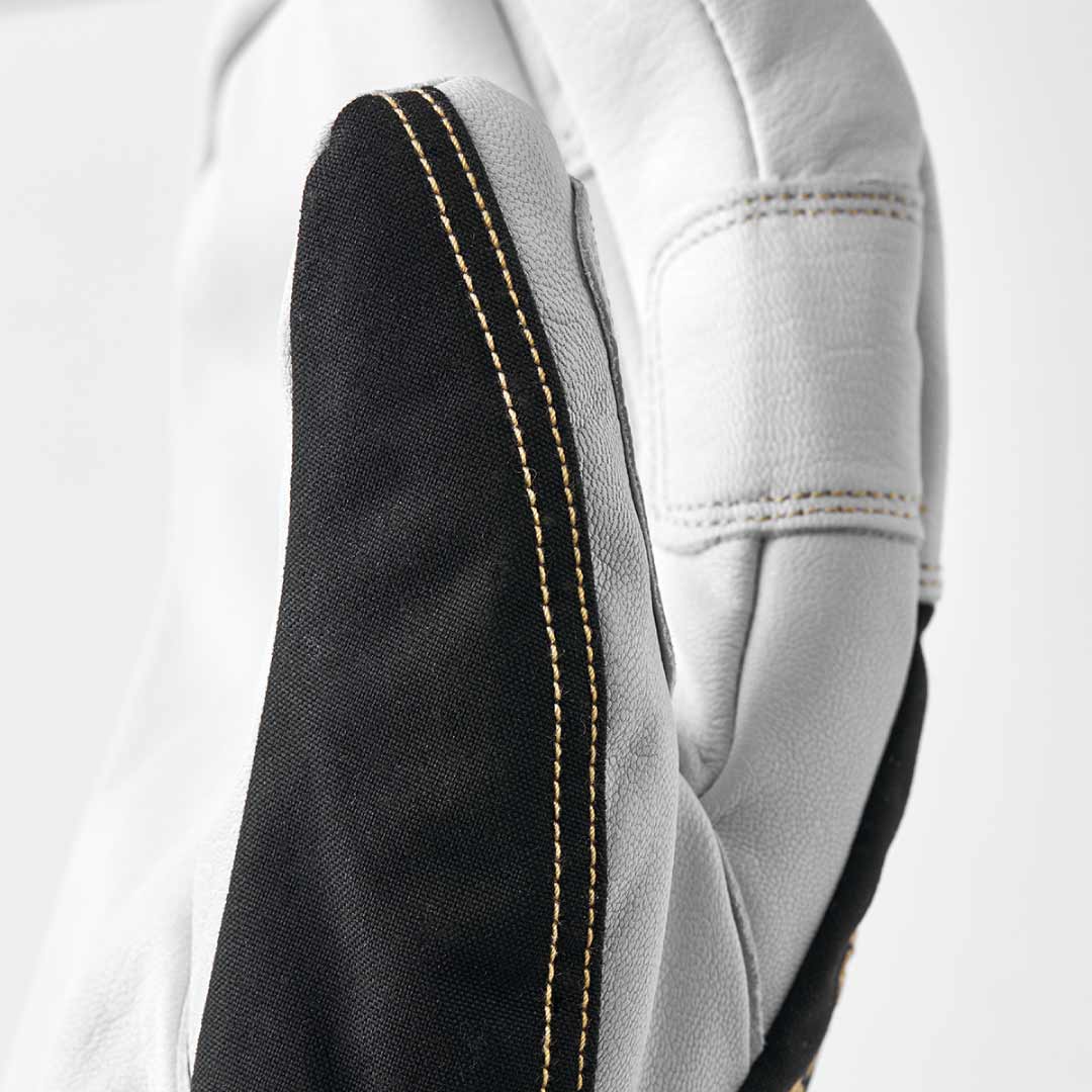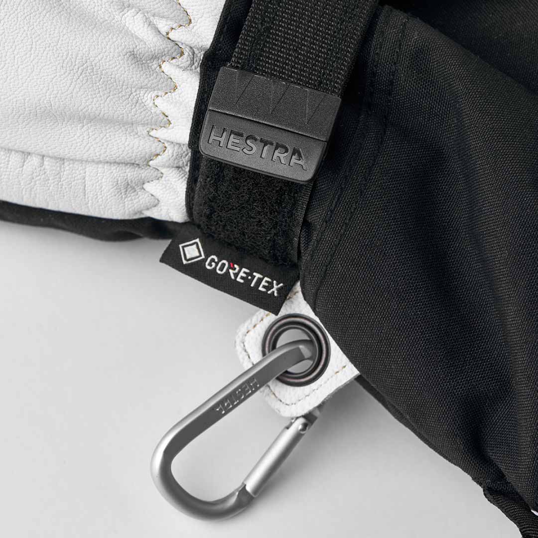 世界中のスキーガイドが愛用するロングセラー「Heli Ski」のデザインと機能をそのままに、環境に配慮したePEメンブレン採用のGORE-TEXをインサートした完全防水の3フィンガーモデルです。手のひらから指先は耐久性と強度に優れたゴート(山羊)皮革、表側から手首全体はナイロンファブリック、中綿は暖かなG-Loftポリエステル、ライナーは取り外し不可の固定式です。毎日の使用にもへこたれない丈夫さと、タイトな操作性を維持しつつ、グローブ全体の軽さが際立ちます。長めのカフは、ウエアの袖口ごと包み込んで装着してベルクロ留めするタイプ。一時的にグローブを外しての作業に便利なハンドカフとカラビナ付きです。
