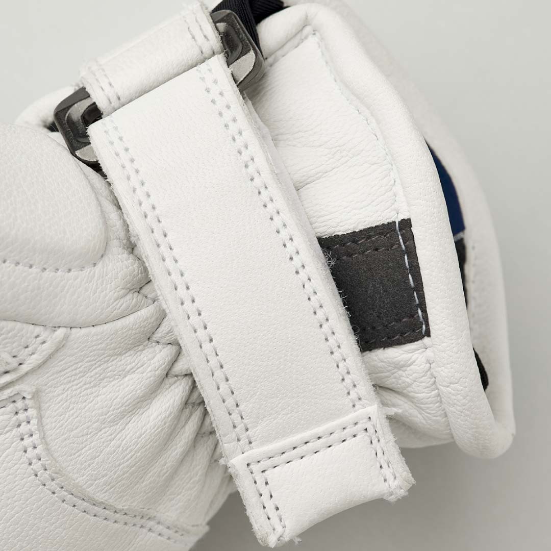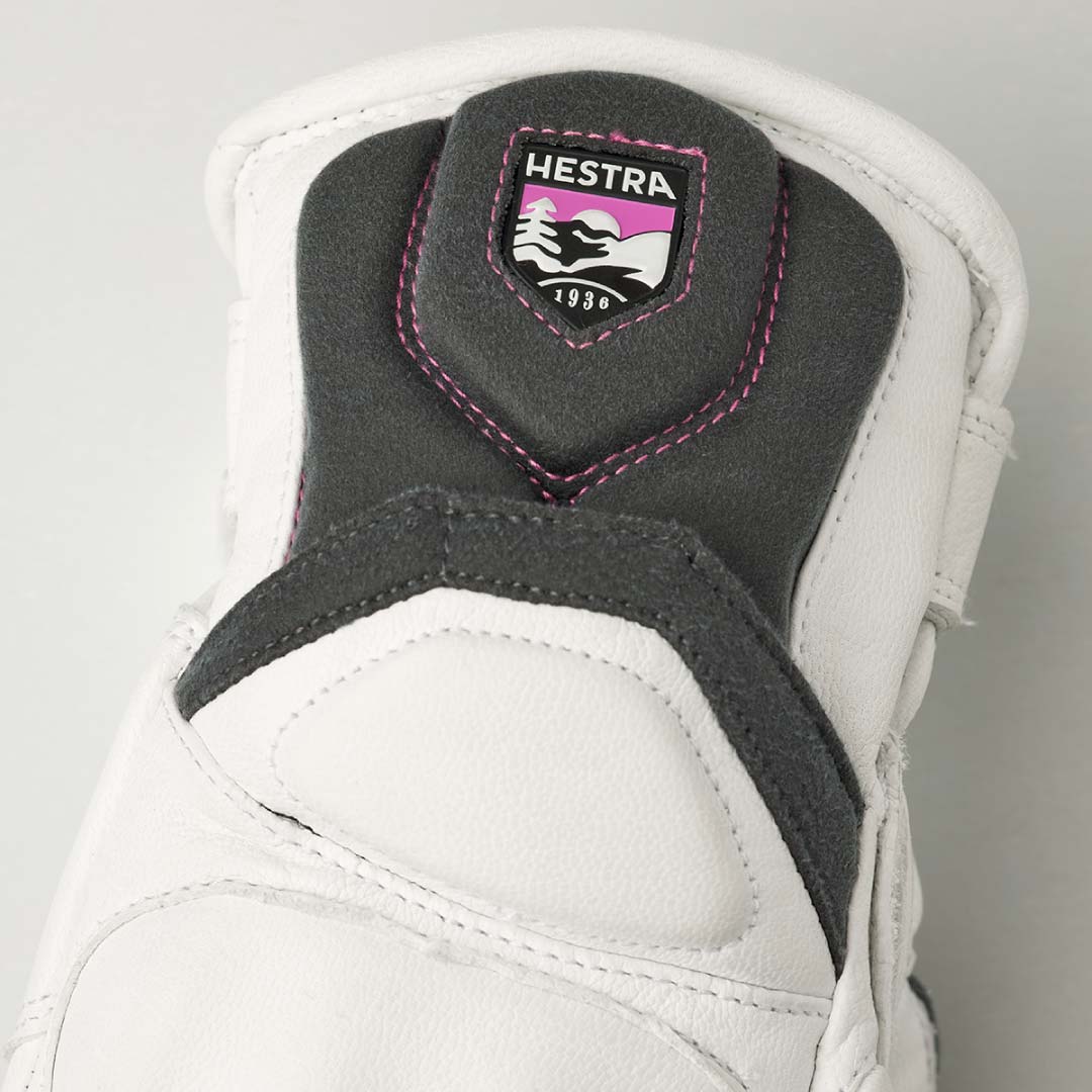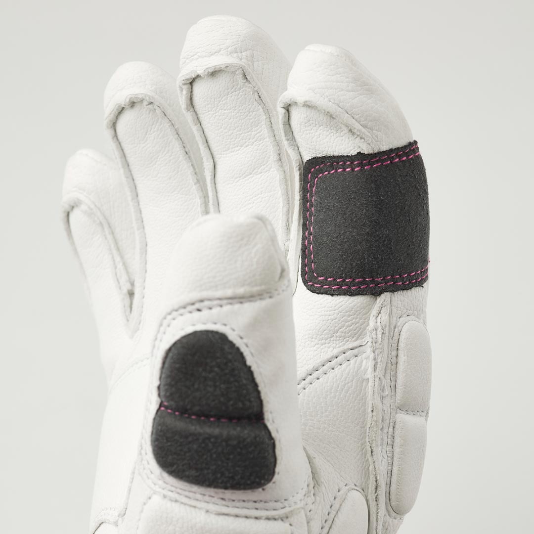 ジュニアレーサー向けのショートカフグローブ。ゲートや雪面などからの衝撃に対応するプロテクションが各所に配されています。