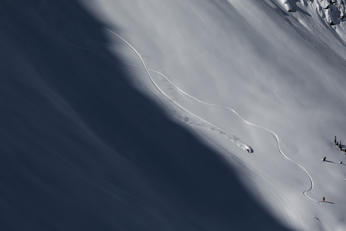 間もなく僕の番だが、滑るラインをまだ迷っていた。真ん中にあるジャンプを飛べるだろうか……。決して難しいジャンプではないけれど、これまで掛けた労力と時間を考えると、絶対にミスはできない。今回を逃せばこの斜面をもう一度滑れる保証は全くない。スノーモービルやヘリの撮影だったら迷いなく飛ぶだろうし、1本飛んで2本目はトリックにチャレンジ……なんてことも考えられる。でも自分の足で登るビックマウンテンの撮影は、自分の実力と斜面と対話しながら、いつも一本勝負だ。