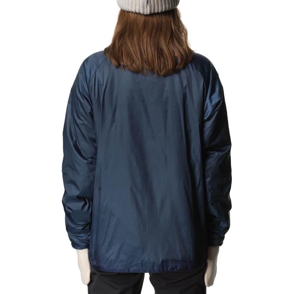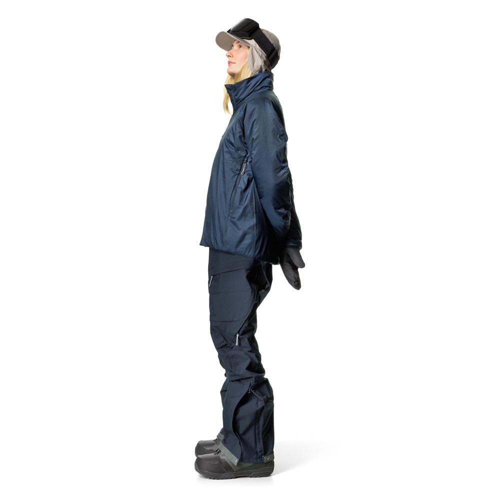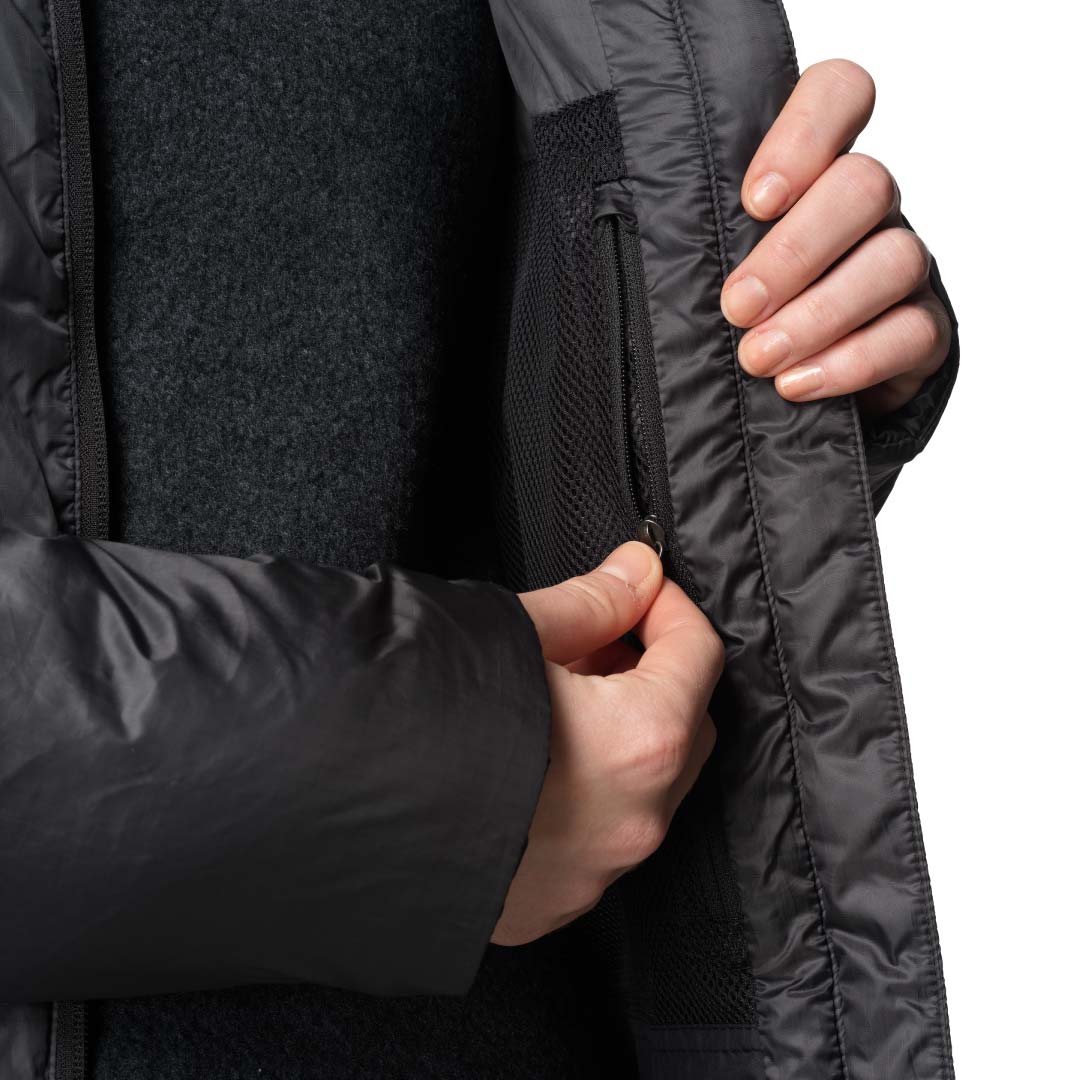 スウェーデン語で「ダウンフリー」を意味するDunfriには、ダウンが一切使用されていません。ダウンやフェザーなど動物性の素材を排し、代わりに合成断熱材を中綿に採用することは、その機能的なメリットに加え、アニマルウェルフェアの観点からも、人間の快適さのために鳥が苦しむべきではないというHoudiniの信念によるものです。