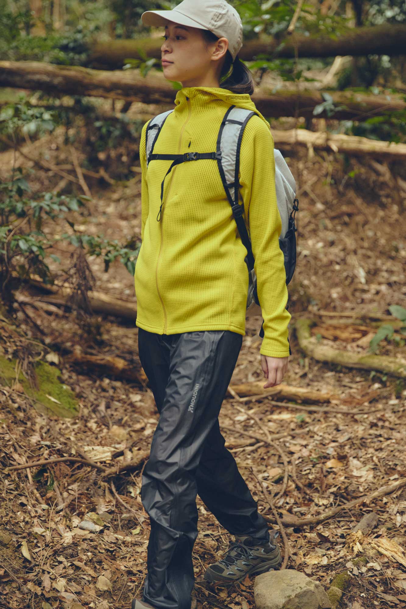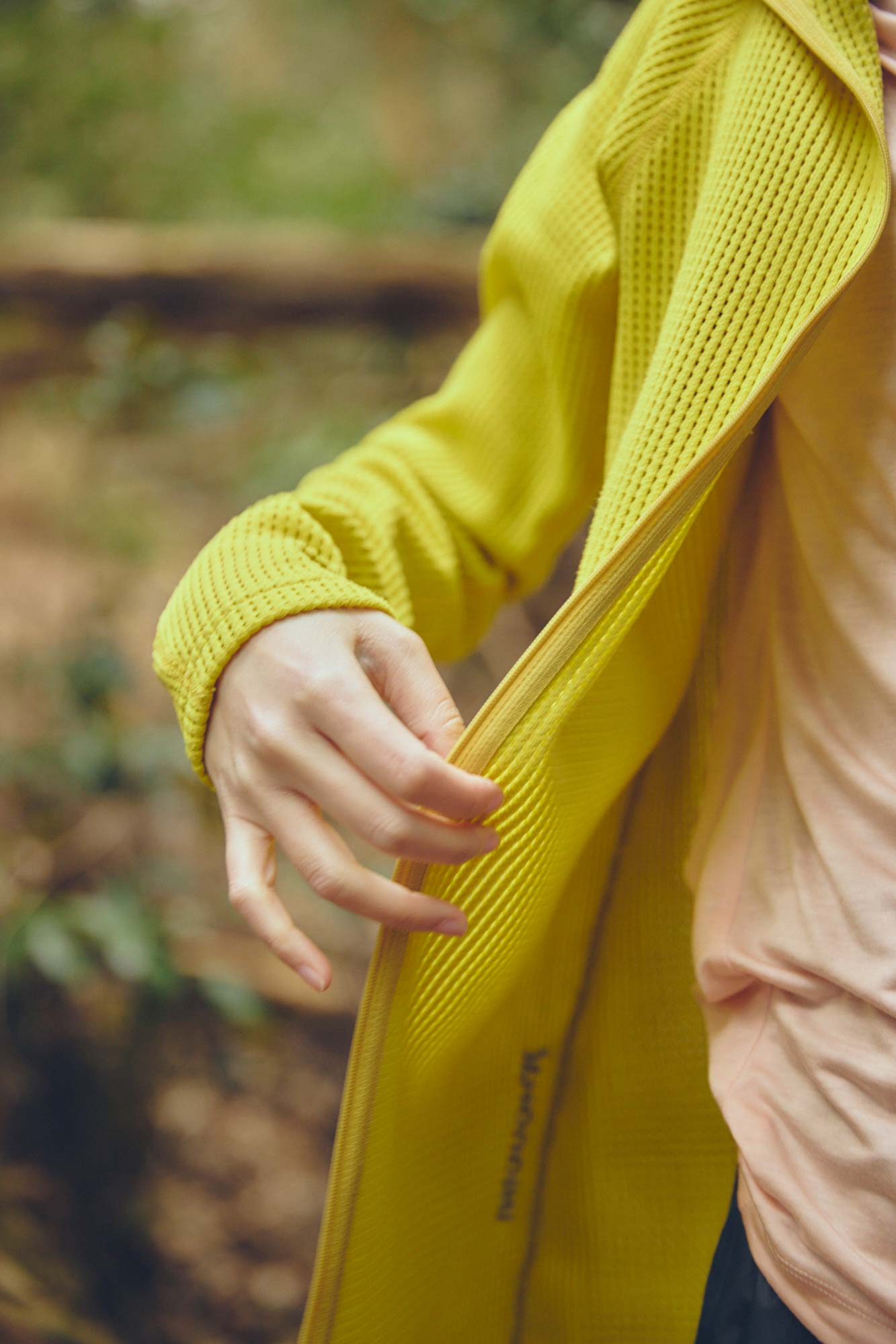 高性能な生地は、最新のPolartec® Power Dry® Meshで作られ、余分な熱を閉じ込めることなく断熱性を提供するメッシュ構造により、レイヤリング次第で異なる効果を得られることが特徴です。アウターとして着用すると、強力なエアフローにより衣服内に空気が流れて余分な熱や湿気が排出され、シェルの下に着用すると、暖かい空気の層が構築されて優れたレベルの断熱効果を発揮します。また、素材は高い速乾性と耐久性をもつリサイクルポリエステル100%で、リサイクル可能であり、フィラメント繊維構造により、通常のフリースに比べてマイクロファイバーの抜け落ちはほとんどありません。