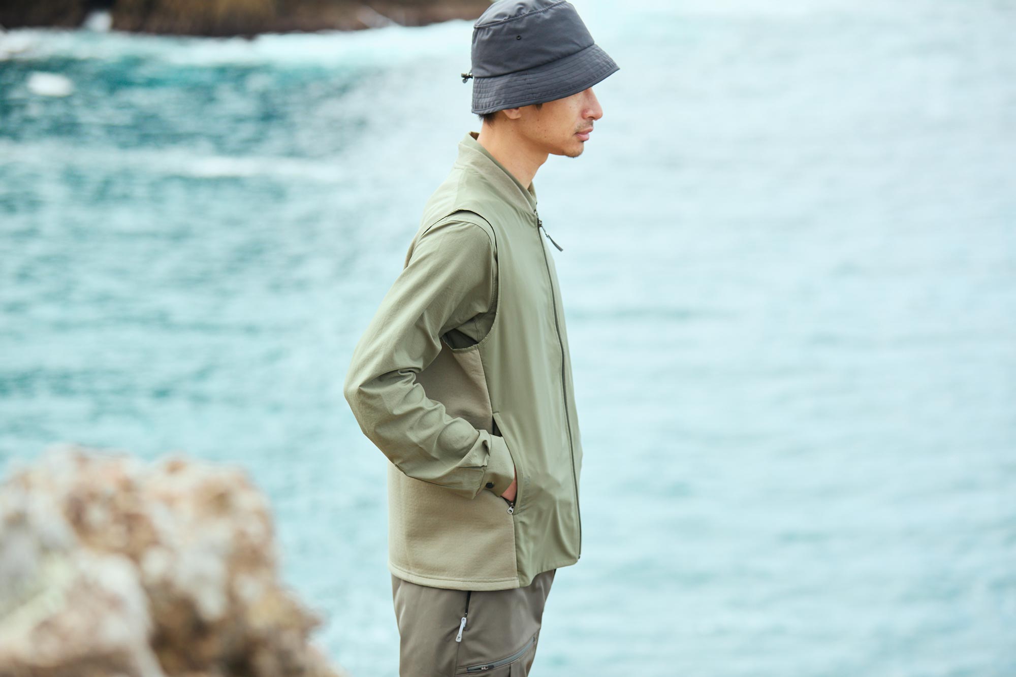 Mono Air Vestは、フリースに代わる新世代のテクニカルウェアとして開発され、受賞歴もあるMono Airシリーズと同様のコンセプトを元にデザインされたベストです。それは、海洋プラスチック問題への対策を目的とし、米国ポーラテック社が特別に設計したPolartec® Power Air Lightを採用することで、従来のフリース製品と比較してマイクロファイバーの抜け落ちを最大80%削減することに成功しました。さらに、軽量で暖かく耐久性に優れた生地は、リサイクル素材およびリサイクル可能素材で作られているため、機能性と持続可能性の両方を実現しています。