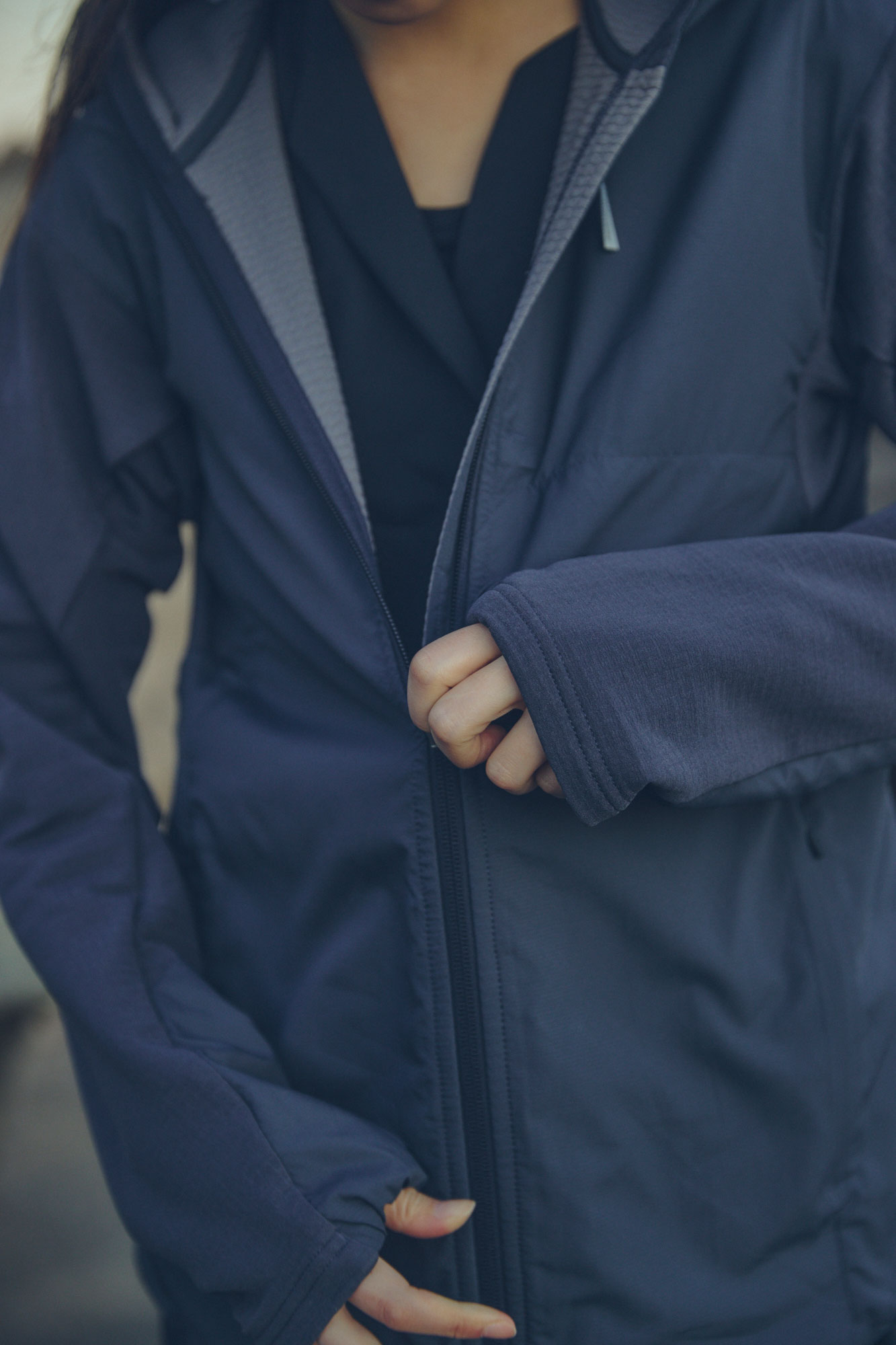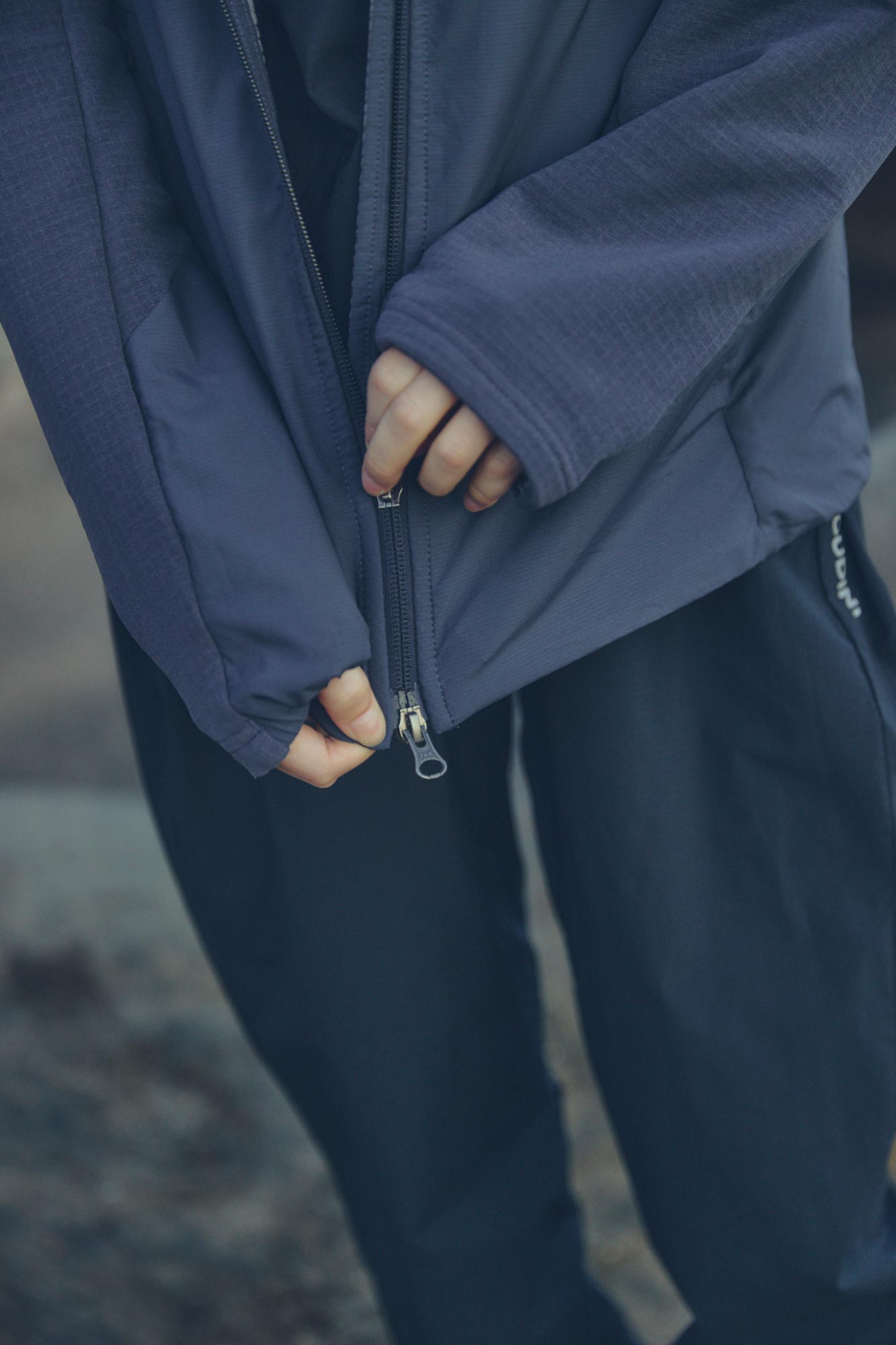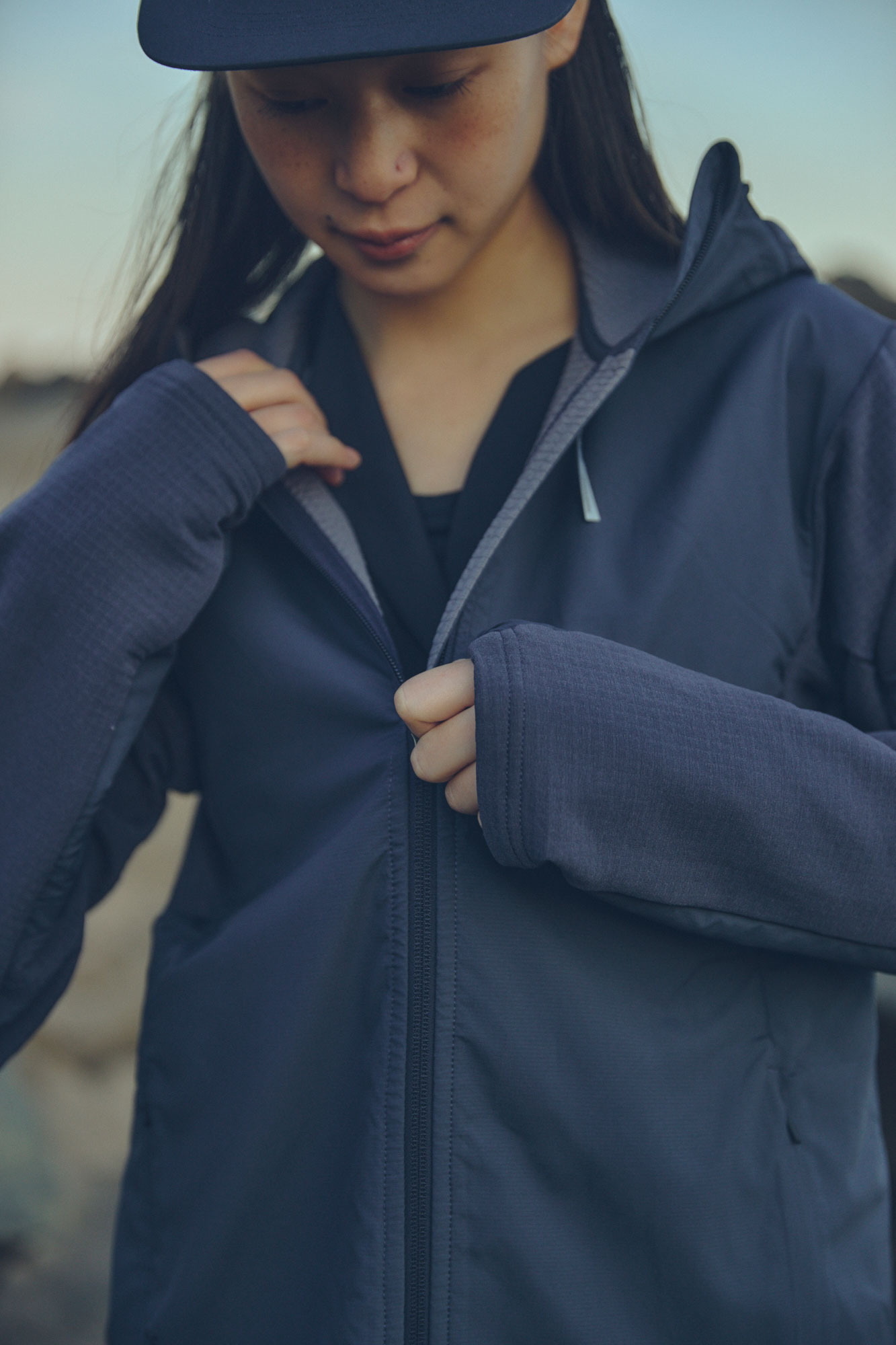 メイン生地は、Polartec® Power Air™ ActiveとC9 Ripstop™の2種類の生地で構成されています。Power Air™は、暖かくて伸縮性があり、着心地の良いストレッチフリースで、滑らかな表面はレイヤリングに最適です。C9 Ripstop™は、かさばらない超軽量の防風生地で、重さを感じさせません。この2つの生地は、高山環境などでの激しいアクティビティにおいて、保温性や通気性を必要とする身体の各部位に配置されています。また、ぴったりとフィット感の良いフードは頭を保護し、2つのサイドポケットとチェストポケットが荷物をしっかりと収納します。