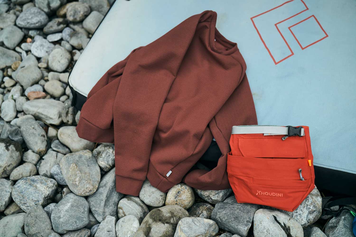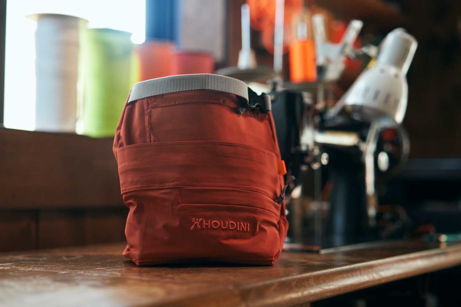 Houdiniのアウトドアウエアをリメイクしたこのチョークバッグも、クライミング仲間からの依頼で作ったものだ。表地は3レイヤーのシェルジャケットのポリエステルで、ライナーには同じく着古したOutright Houdiのフリース素材を使っている。