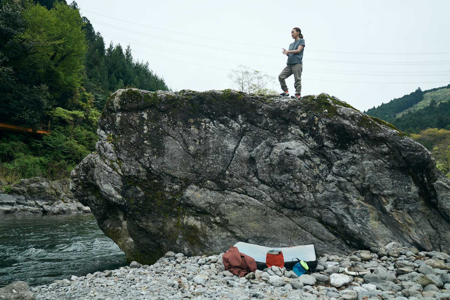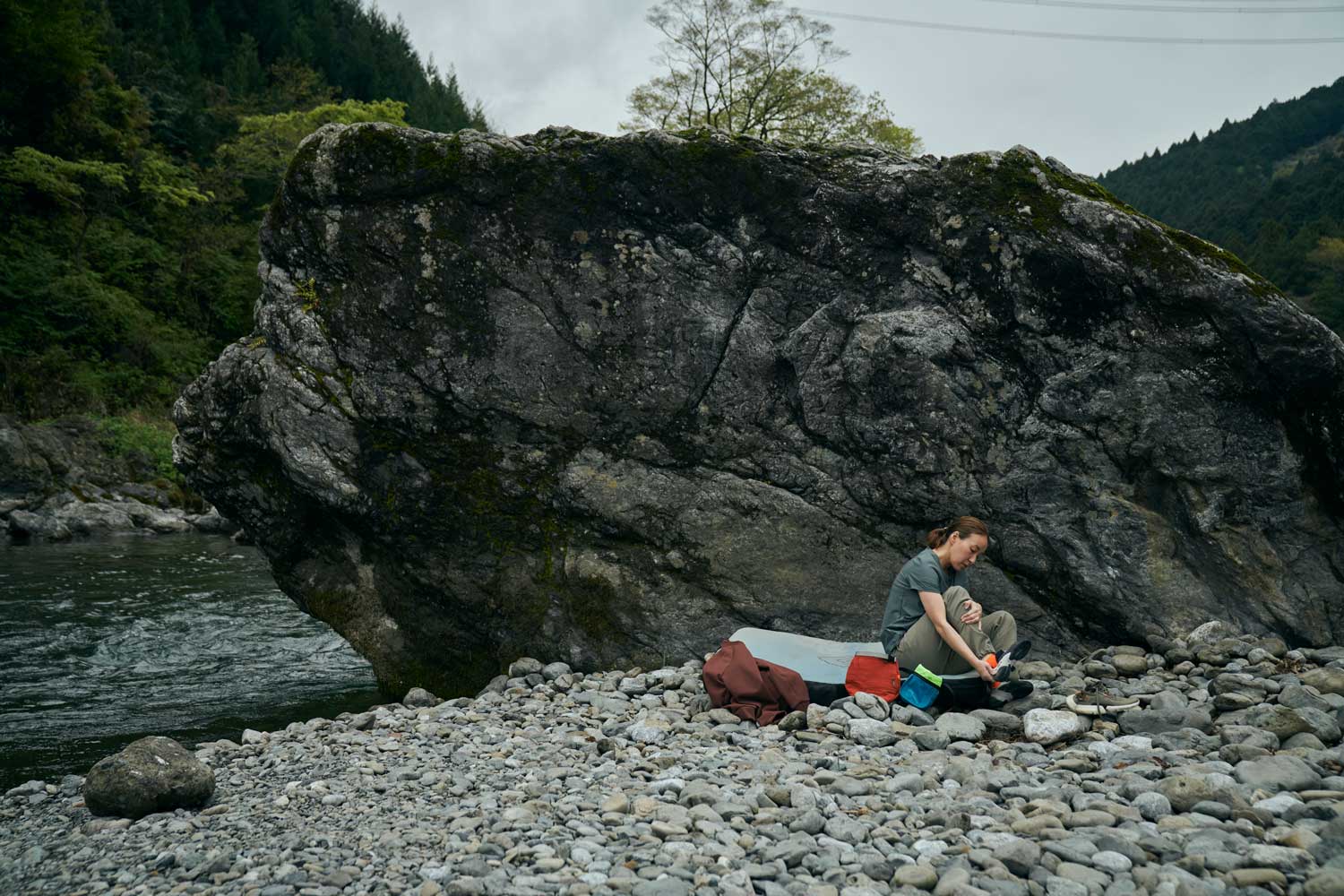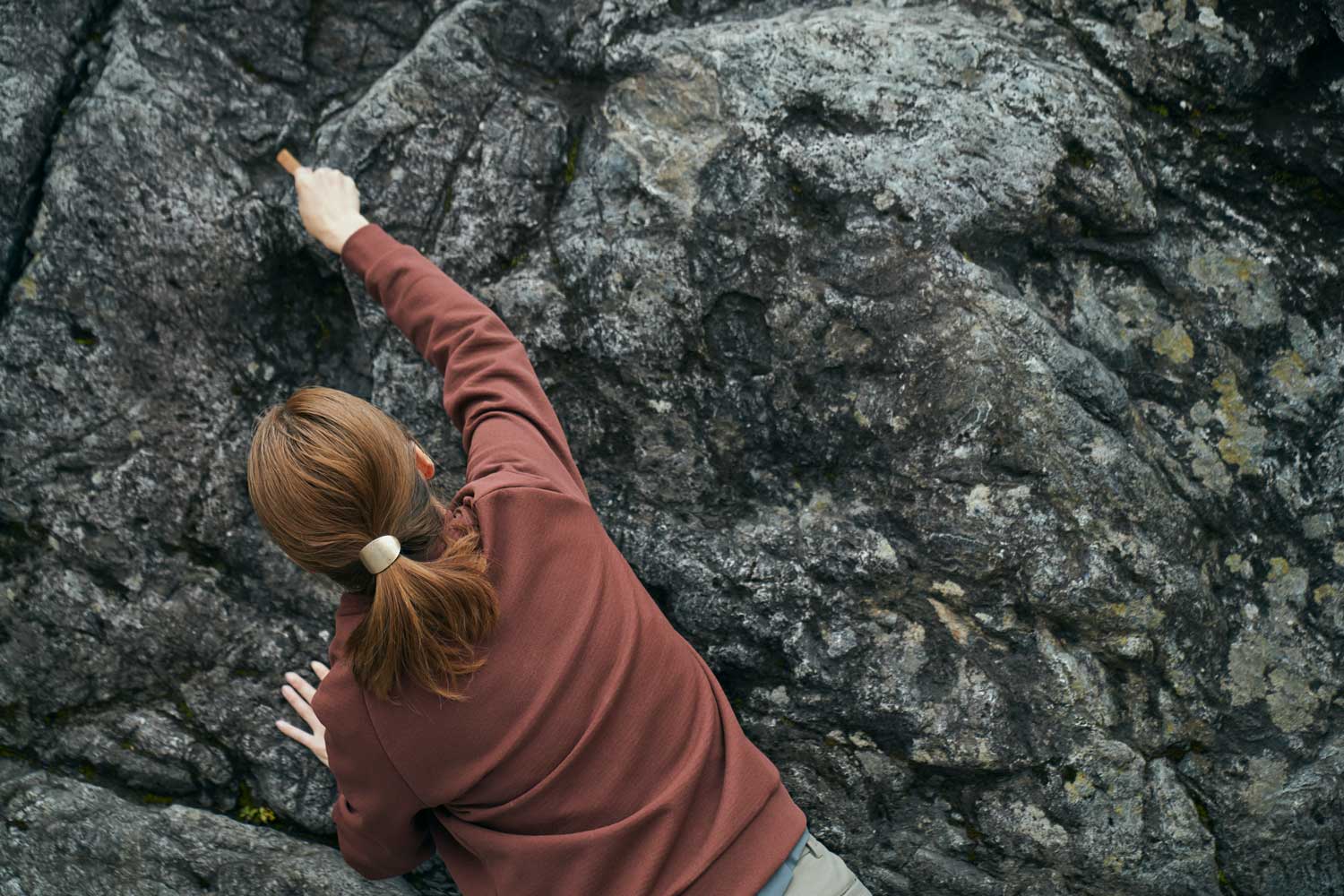 そのなかで底部を貫くポケットは、底を重くして置き型チョークバッグを倒れにくくする工夫であり、冬の岩場で中に使い捨てカイロを入れて使えば、ほのかに温かなチョークが、冷え切った手に優しい。それはまさにクライマーでありデザイナーの澁谷さんらしい着想である。