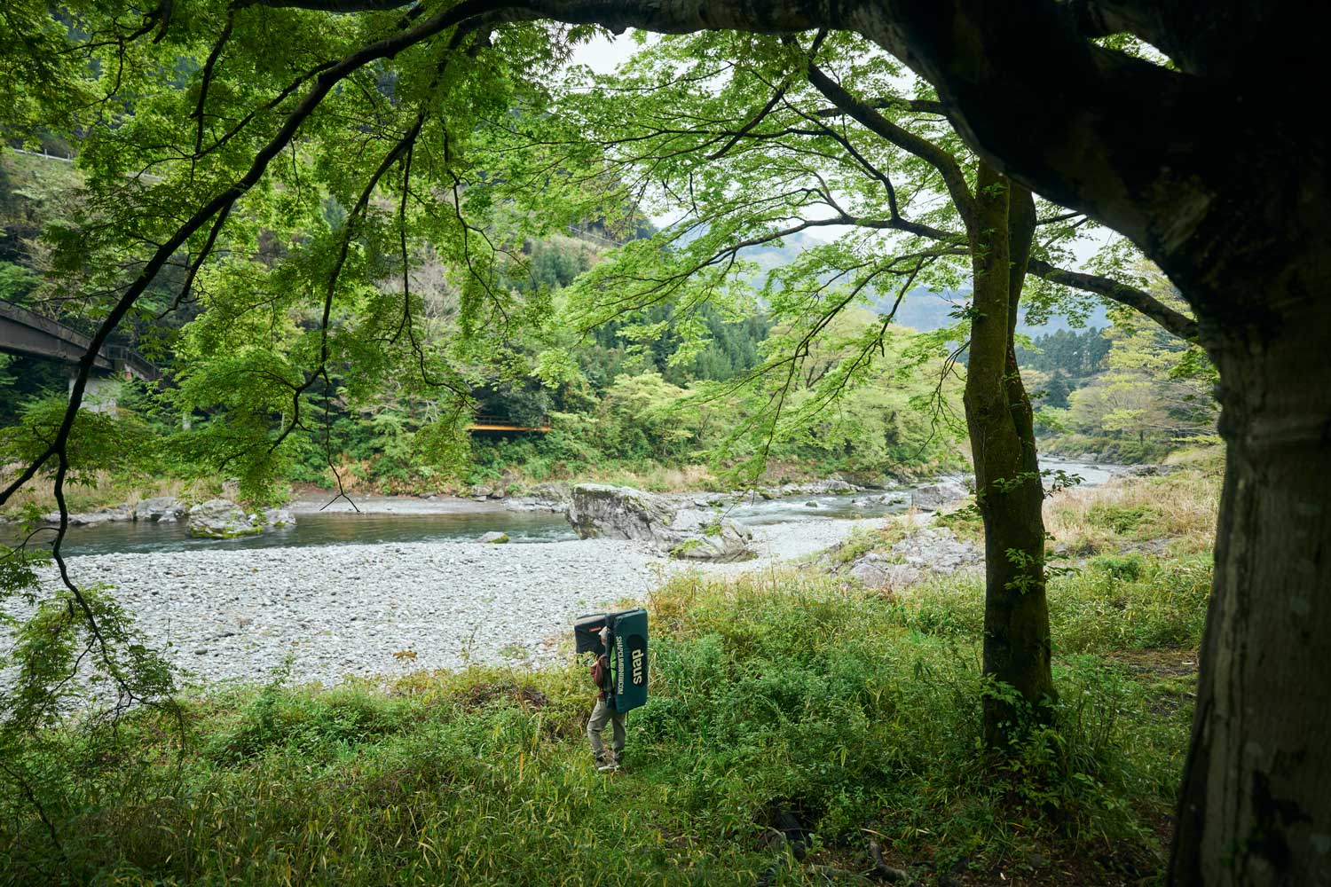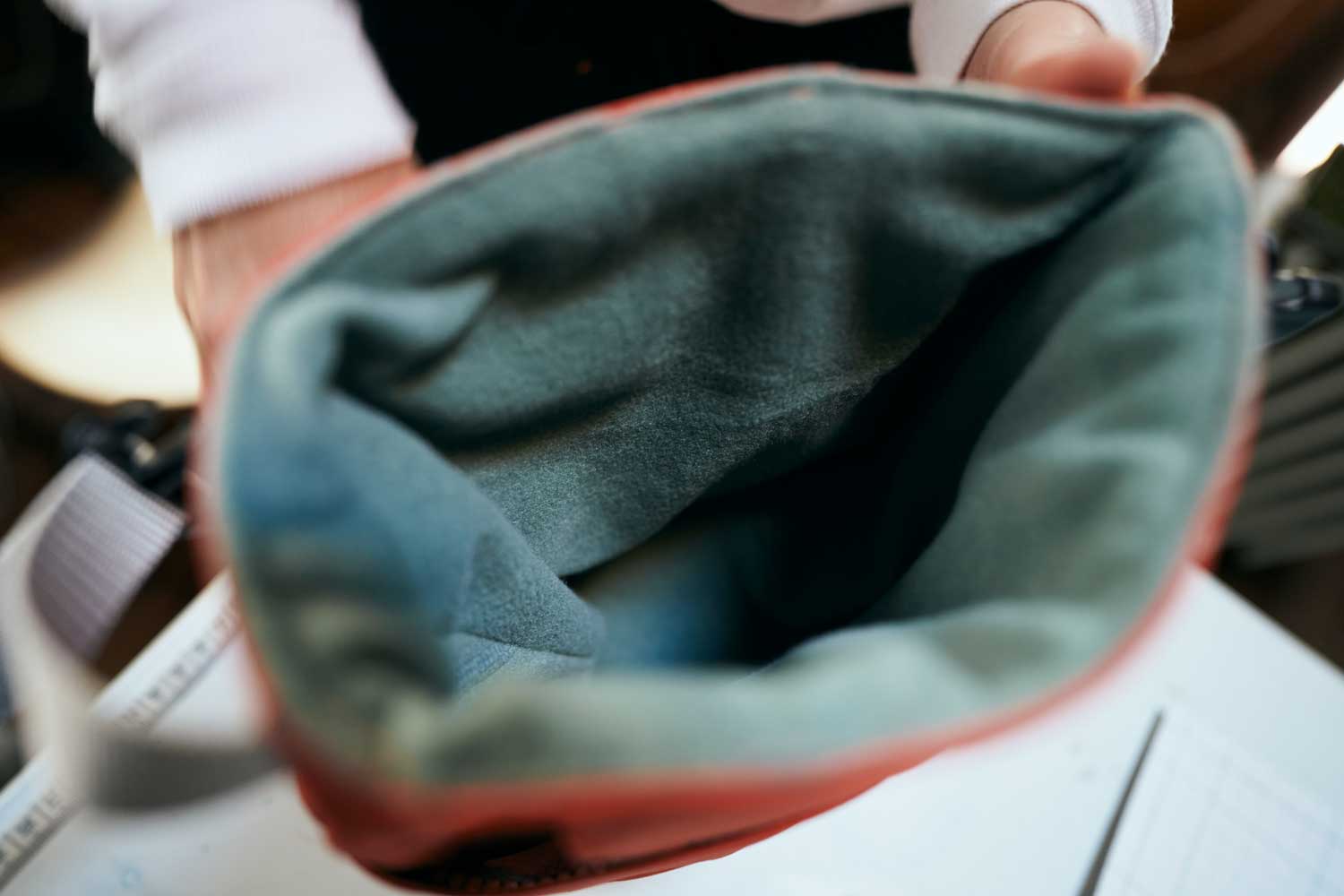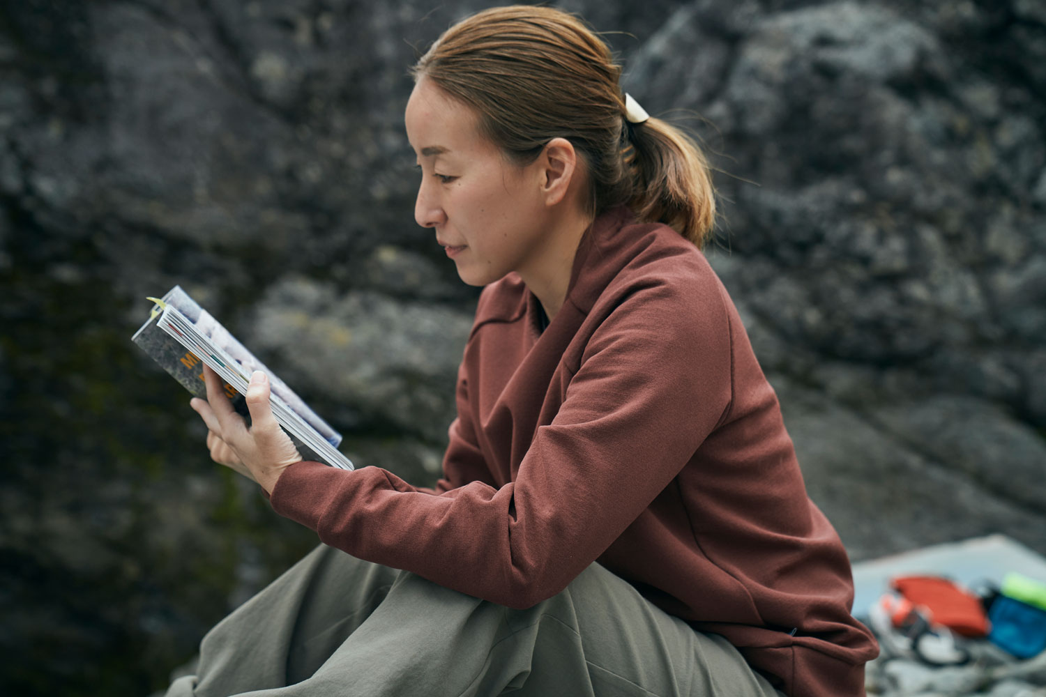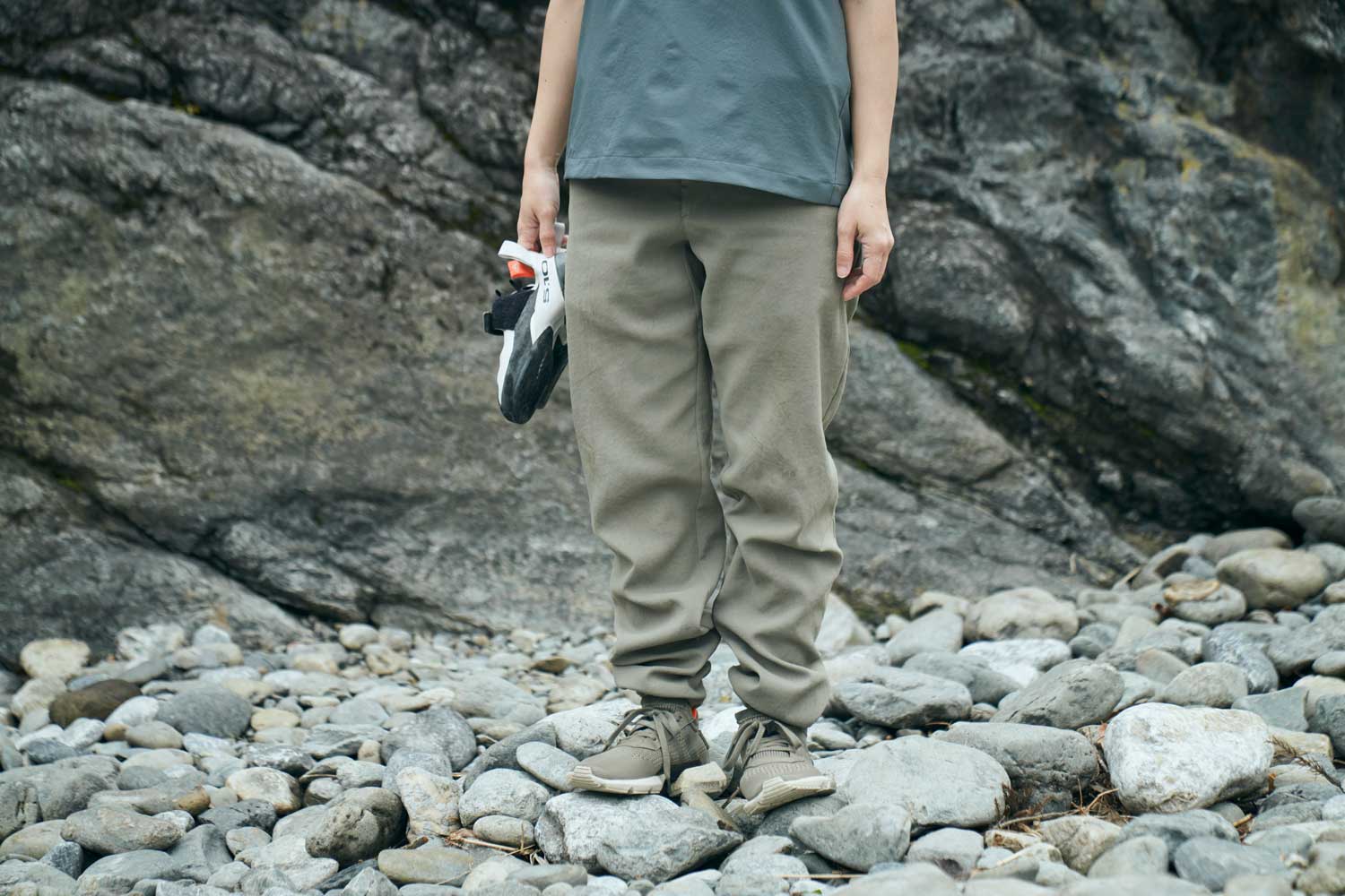 そのなかで底部を貫くポケットは、底を重くして置き型チョークバッグを倒れにくくする工夫であり、冬の岩場で中に使い捨てカイロを入れて使えば、ほのかに温かなチョークが、冷え切った手に優しい。それはまさにクライマーでありデザイナーの澁谷さんらしい着想である。