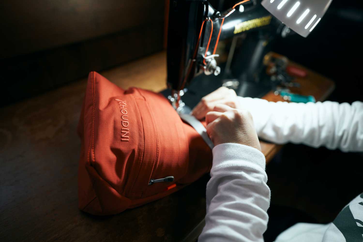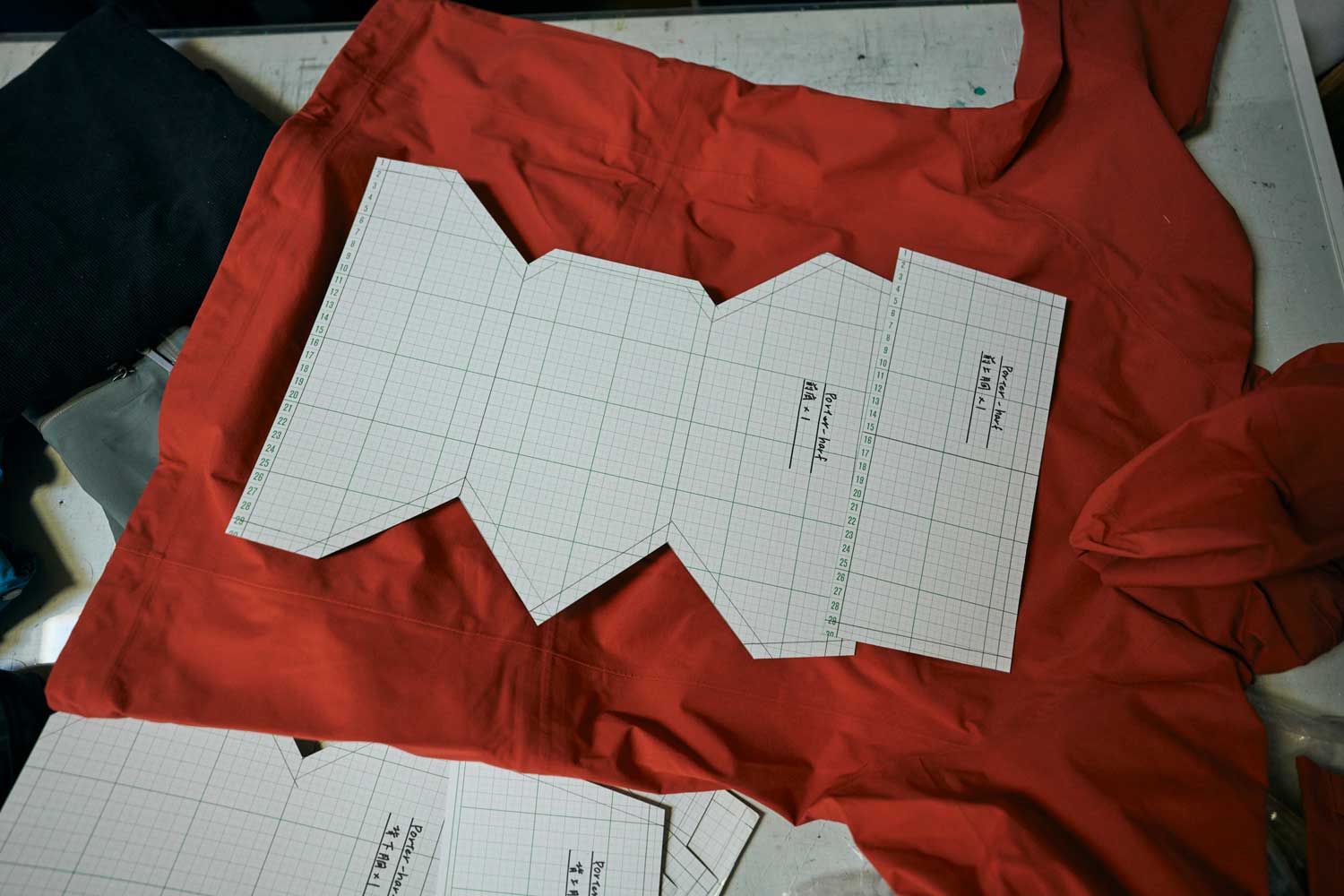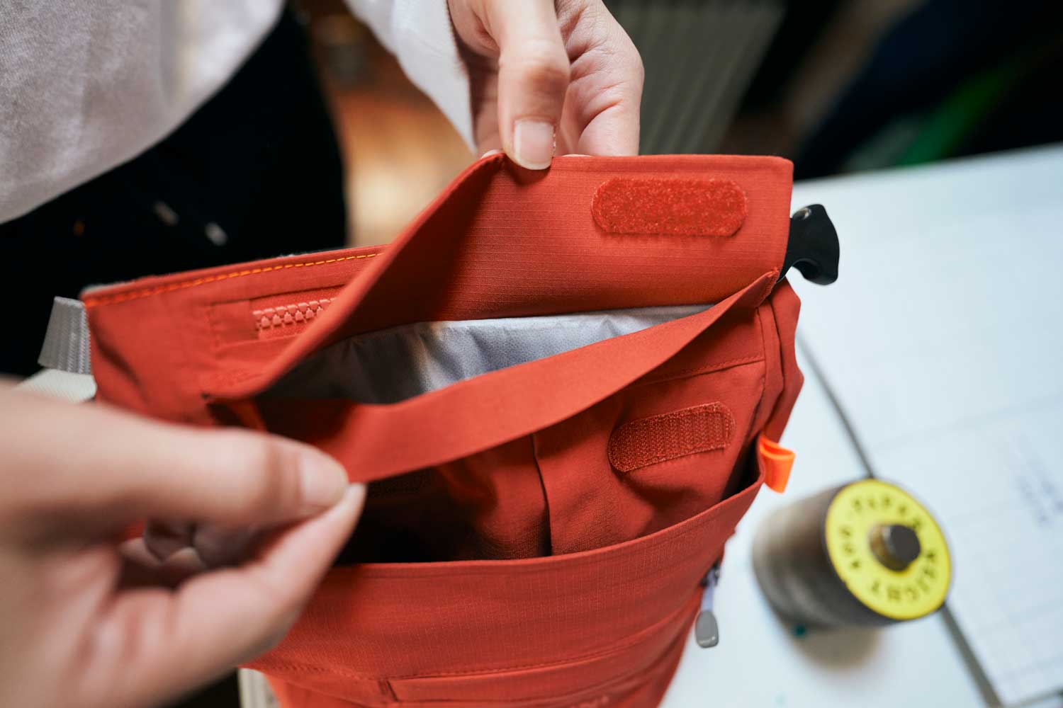 「これはボルダリング用の置き型チョークバッグで、5枚のパネルと1枚のインナーを縫い合わせて作ります。その際、ポケットやいろいろな部位を生かしながらパターン(型紙)に合わせて粗切りしていくのですが、その際、どこをどう組み合わせるかを考えるのが楽しいんですよ」