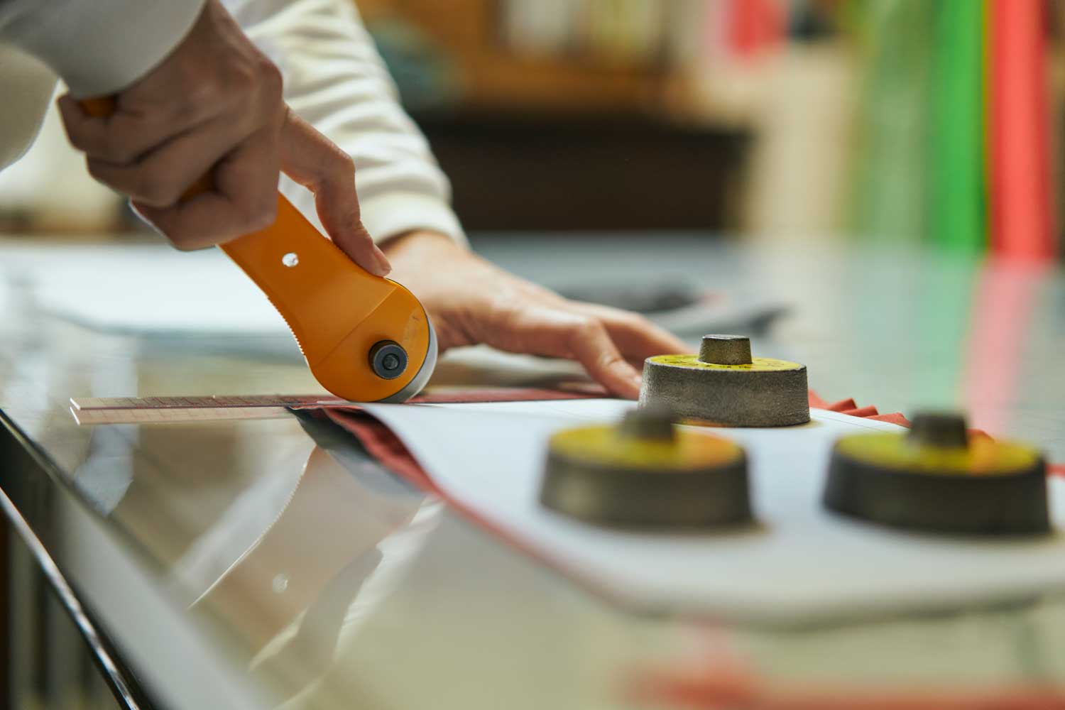 澁谷さんは自らのブランドを立ち上げるに際し、ロスや廃棄を減らした、無駄のないモノ作りをしたいと考えた。たとえば、生地を無駄なく使うために生地幅に合わせて形を決め、そのうえで、裁断で残端が出ないようパターンを工夫した。