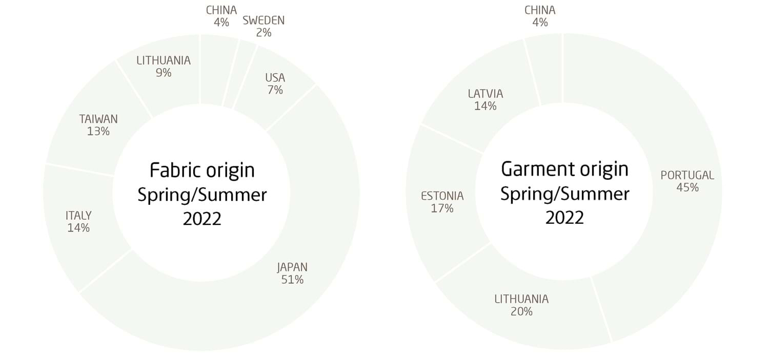 私たちは常に完全な透明性を目指して取り組んでいます。上記は2022年春夏コレクションの生地と衣類の製造国を示しています。
