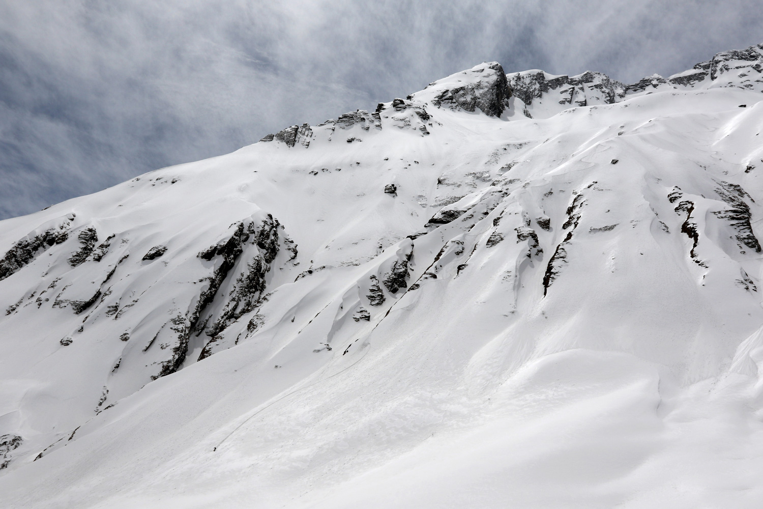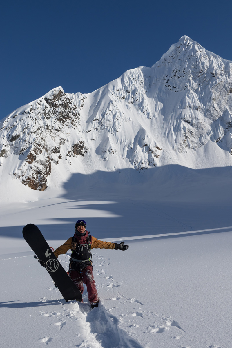 撮影を予定していたのはホワイトファングという山で、登る準備をしているボトムにまで雪崩が押し寄せ、膝まで埋まるという不安なスタートだった。標高差400mほど、斜度50°の急斜面、20cmのフレッシュドライスノー。後半の核心部はチャンネルとクリフバンドがあり必ずスラフが起こるであろうから、セーフティーラインのことで頭が一杯のドロップイン。