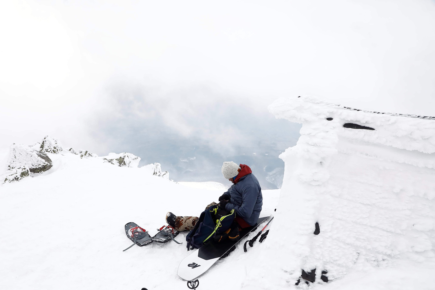 岩木山山頂。風が強く、レンズ交換の際はシェルの上にインサレーションを重ね冷えを防ぐ。Photo: Gaku Harada