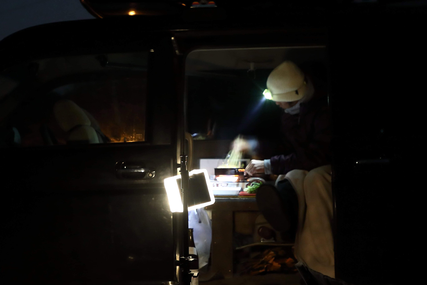 良い雪を滑るには車中泊が必須。フィールドに近く撮影もスムーズに。 Photo: Gaku Harada