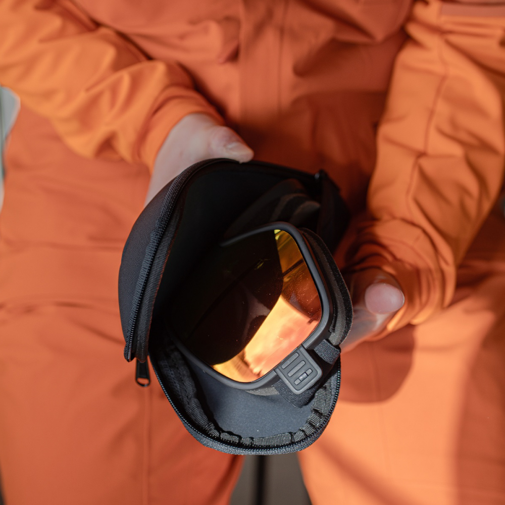 持ち運びの際にゴーグルを保護するよう設計されたケースです。 レンズ側の外装には保護用にハードなフォーム材を用い、ネオプレーンでゴーグルをパックする仕様です。 フォーム材はゴーグルのカーブに合わせて湾曲しており、余計な嵩張りなくバックパックへと収納可能。 ケースにはゴーグルの他に2枚までのスペアレンズが収納でき、汚れを拭き取るスワイプが付属されています。