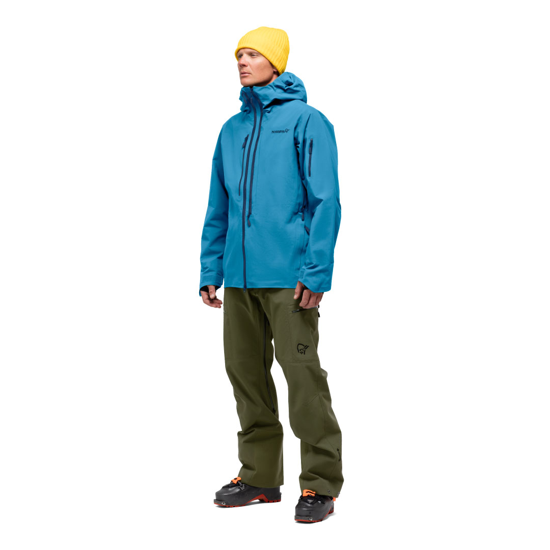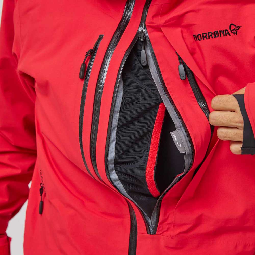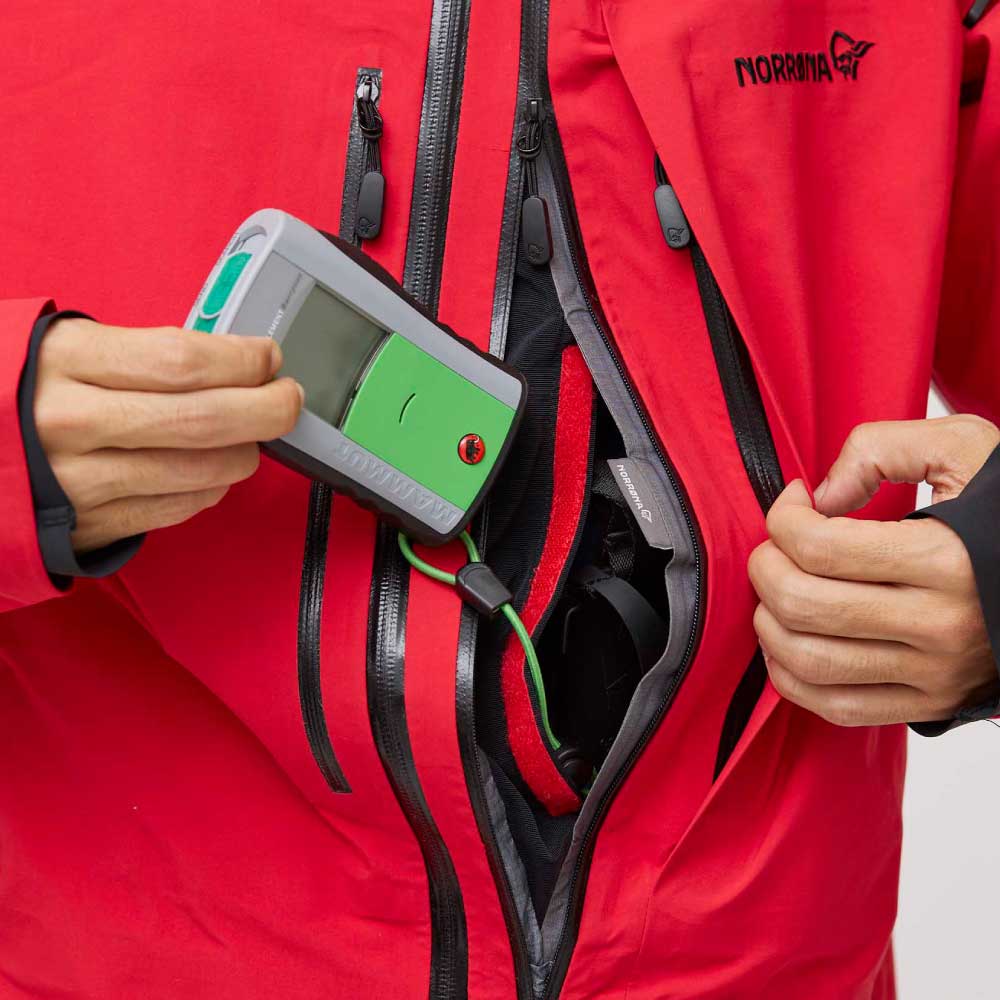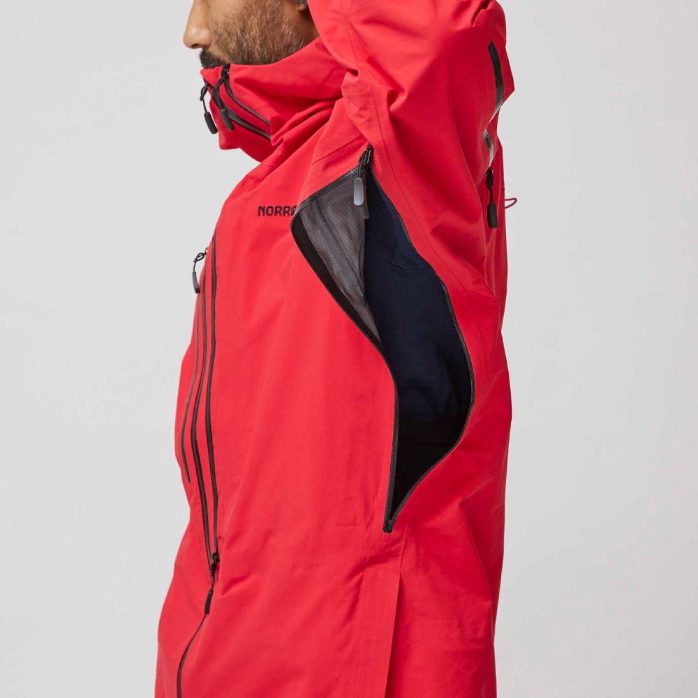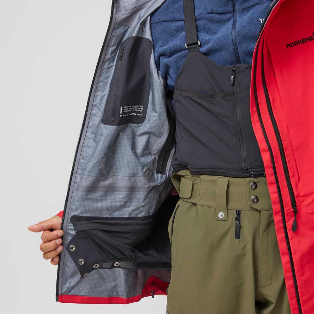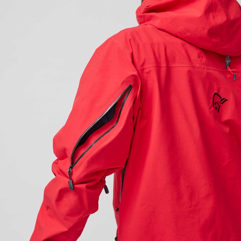 アルパインエリアでのクライム&ライドなど、ハードコアな使用を想定したライディングジャケット。NORR?NAの全ラインナップ中、最も耐久性があり、高い透湿性と耐久性を誇り、タイトなツリーランや岩に囲まれた急峻なシュートも安心して攻めることができます。素材は進化したゴアテックス®プロの高い透湿性を追求したモストブリーザブルテクノロジーを採用。表地のリサイクルナイロンは70デニールをベースに要所を160デニール生地で補強。ブルーサイン認証済みのC6レベルのDWR処理で高い撥水性を維持しています。フロントファスナーを閉めたまま使える首元から大きく開くフロントメッシュベンチレーターに、斜めにセットされた脇下ベンチレーター、さらに熱気の出口となる上腕裏という3つのベンチレーターの効果で空気の流れを生み、より高い換気機能を発揮してジャケットの脱ぎ着の回数を減らします。フロントファスナーを開かなくても素早くアバランチビーコンを取り出せるアクセスホールなど、BC環境に特化したディテールにも注目です。ビブとのセットアップで10個所のポケットが使用可能。バックパックを下ろすことなく長時間行動し続ける滑り手に最適です。