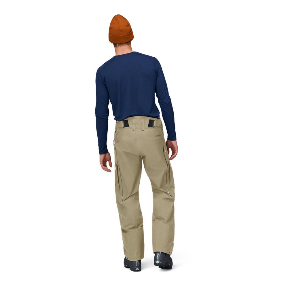 生地は耐久性に優れた3層構造の70デニール×160デニールの100%リサイクル・ナイロンを使用し、裏地は起毛加工が施され、暖かさと柔らかい質感を提供します。エッジガードには金属ワイヤーの代替として使用されるほどの強度を持つVectran(ベクトラン)ファイバーを採用し、ブーツや板のエッジと擦れやすい裾部の耐久性を高めています。膝と尻部に施された立体裁断はハイクアップの際の動きにストレスを与えません。