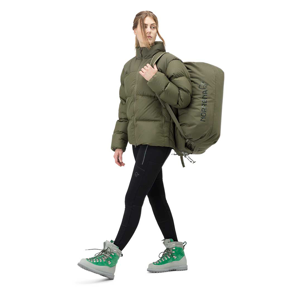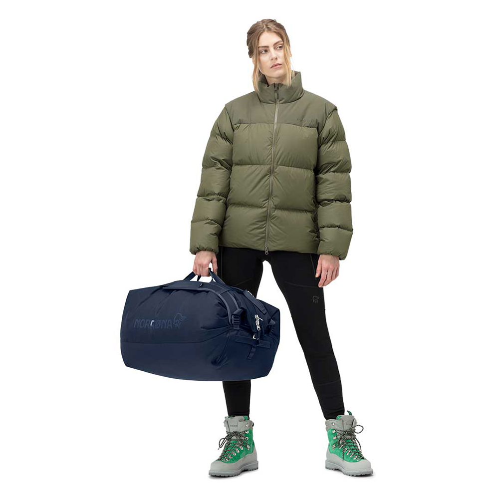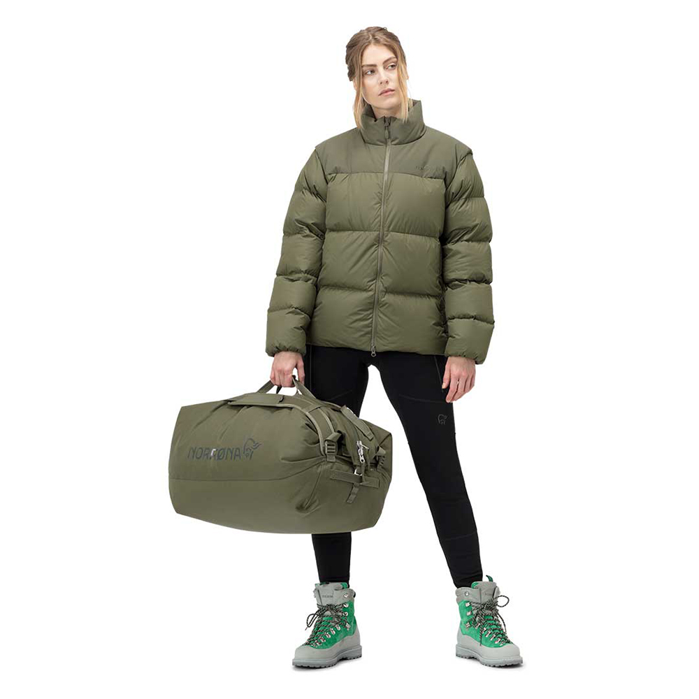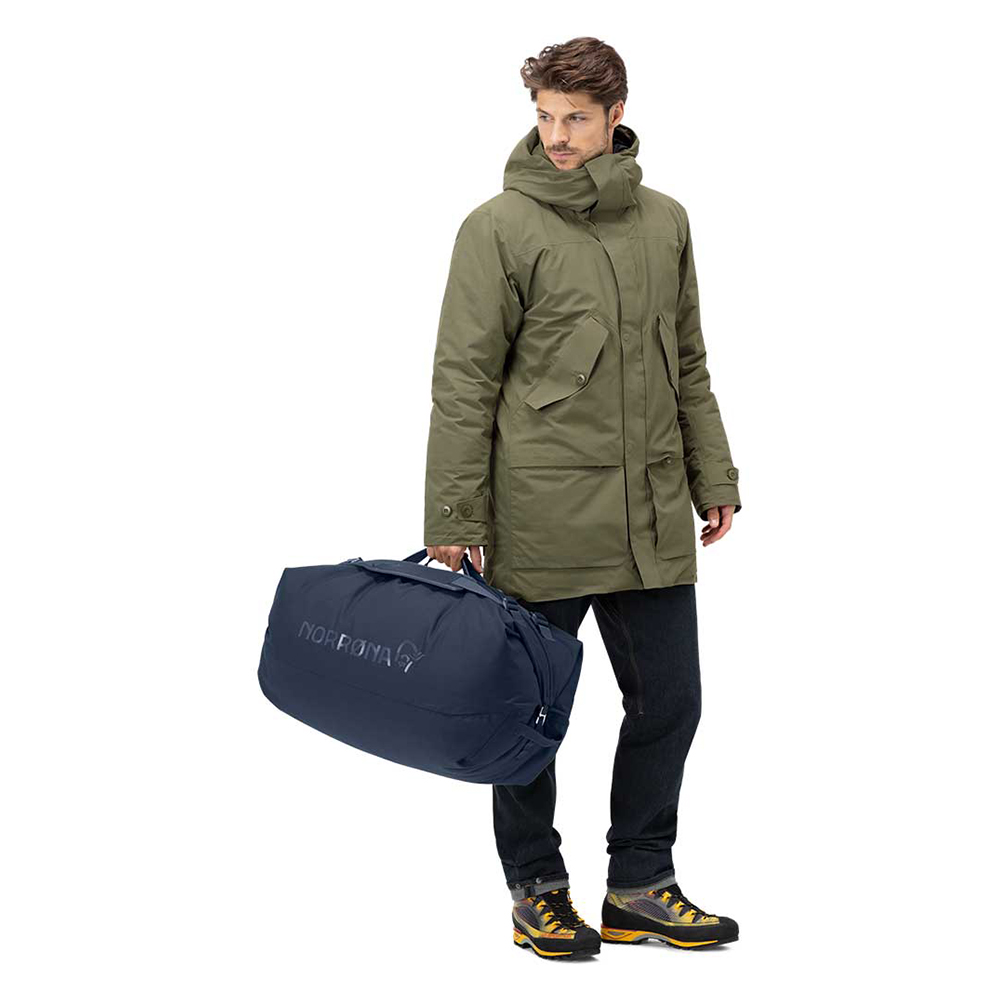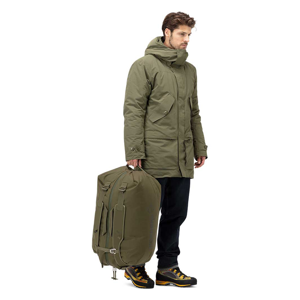 耐久性に優れながら軽量性と収納性を追求したダッフルバックです。メインファブリックには100%廃棄物からリサイクルされた450デニールナイロン生地を用い、ボトムとなる部分は更に頑丈な900デニールナイロンを使用しています。どちらの生地にもPUコーティングが施され耐水圧は2000mmを持っています。調整可能なパッド付きのショルダーストラップとチェストストラップでバックパックとして荷物を簡単に持ち運べ、2つのフロントハンドルに加え、トップハンドルも付いています。また、チェストストラップを使って2本のショルダーストラップを束ねることで、スマートなシングルストラップにすることもできます。T字型のジッパープラーは、手袋やミトンを着用している場合に最適な、より良いグリップを提供します。