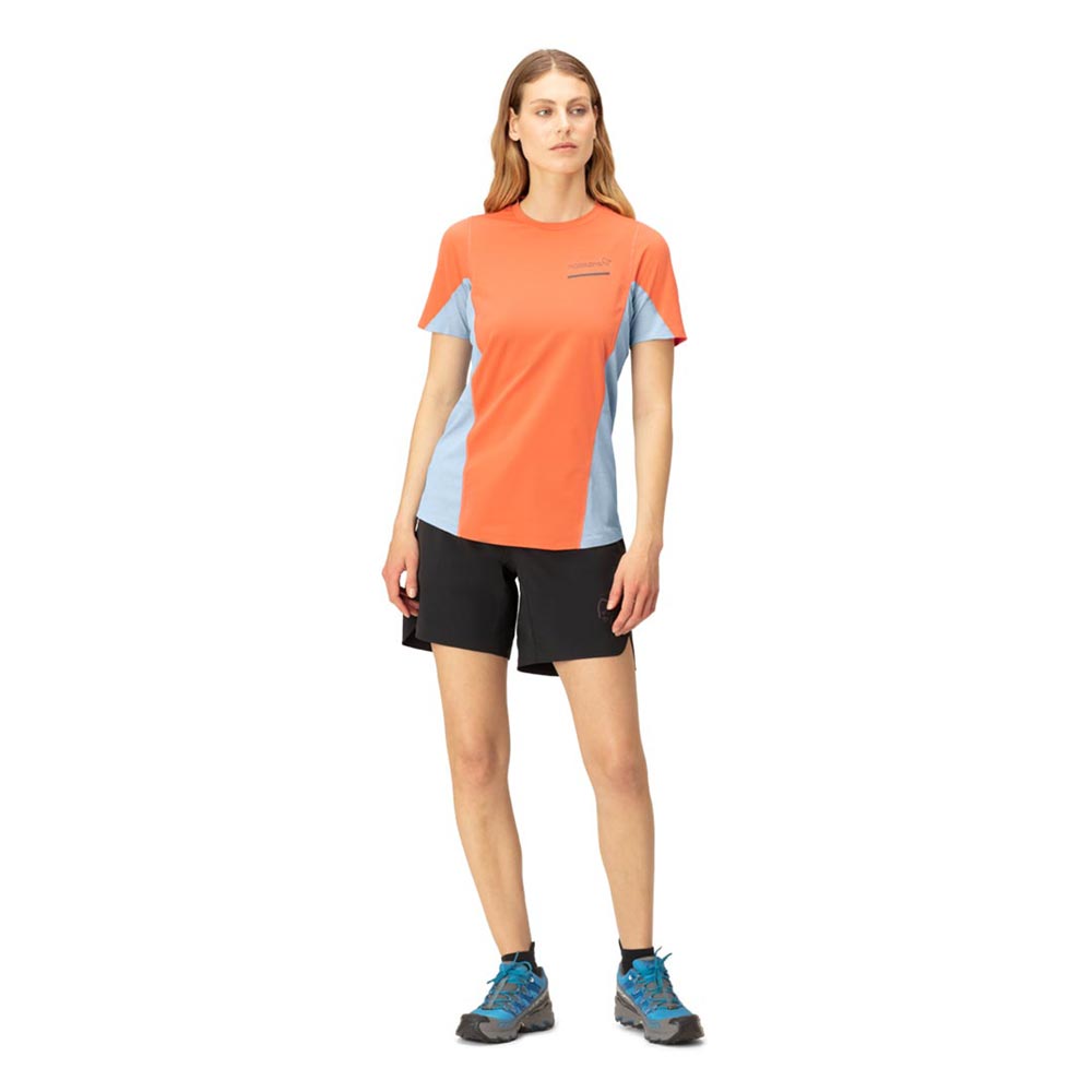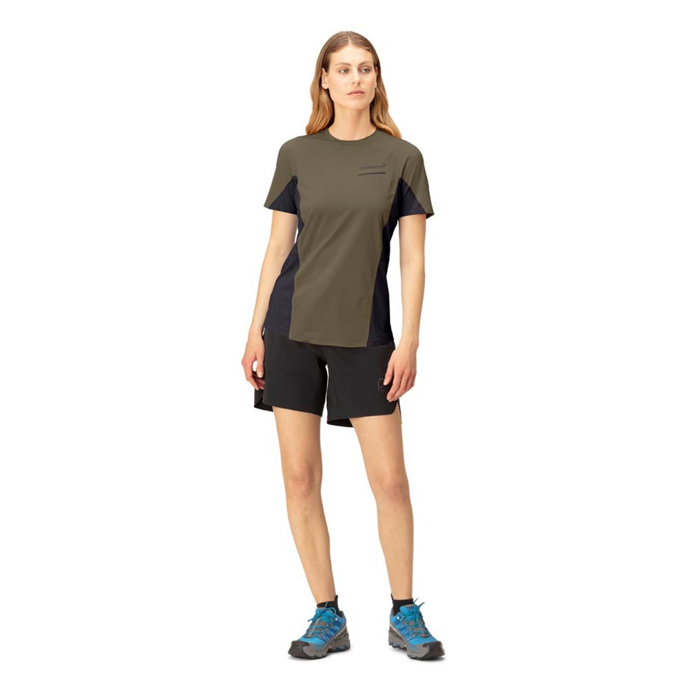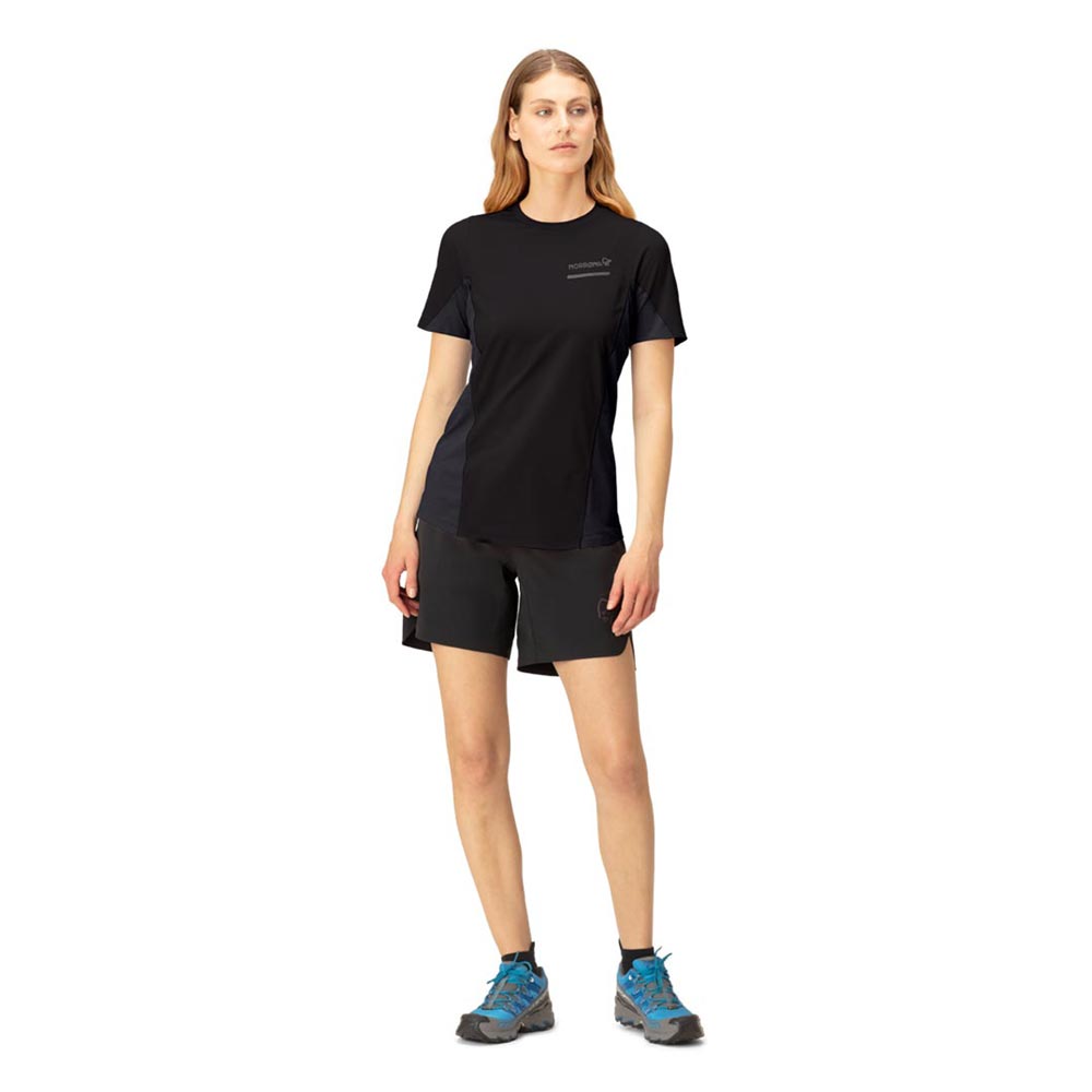 軽量で速乾性に優れたTシャツです。トレイルランニング用にデザインされていますが、柔らかさ、軽量性、吸湿性、速乾性を必要とするあらゆるアクティビティに対応します。メイン素材は、吸水速乾加工が施された100%リサイクルポリエステル(91g/m2、UPF45+)、Teijin Deltapeakを用い、肩・上前に使用しています。別素材は、100%リサイクル・ポリエステル(103g/m2、UPF15+)のダブルニットで、HeiQ Fresh FFLという銀を含まない防臭加工が施されており、汗に含まれる脂肪やタンパク質を除去することで細菌の増殖能力をなくし、臭いを軽減します。この生地は脇の下にも配されている為、防臭効果が高く、洗濯が必要になるまで何度でも使用することができます。