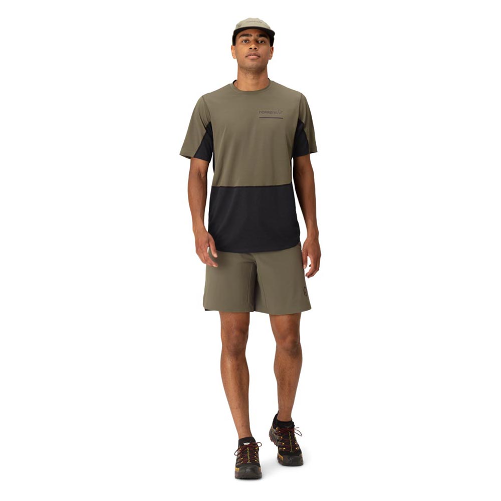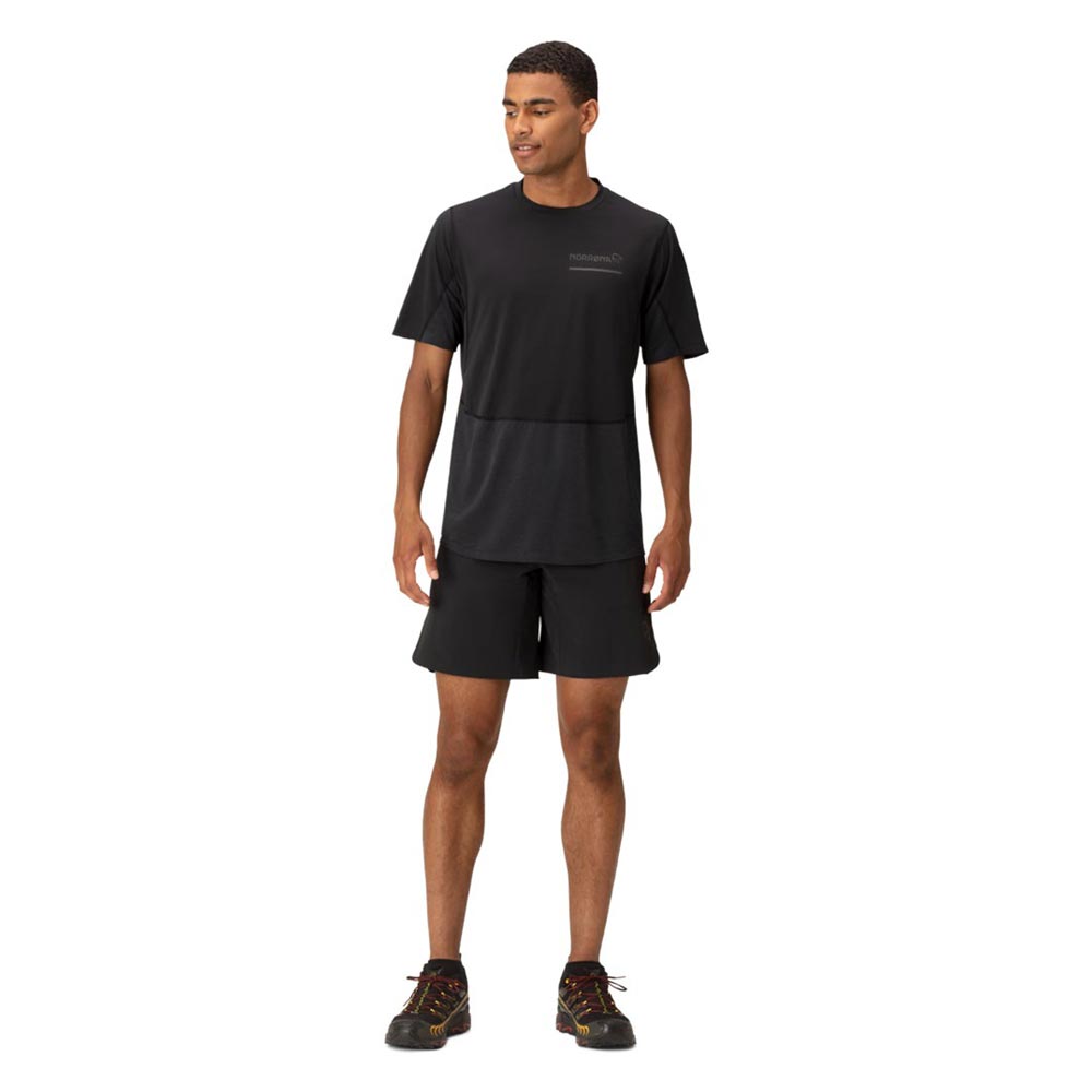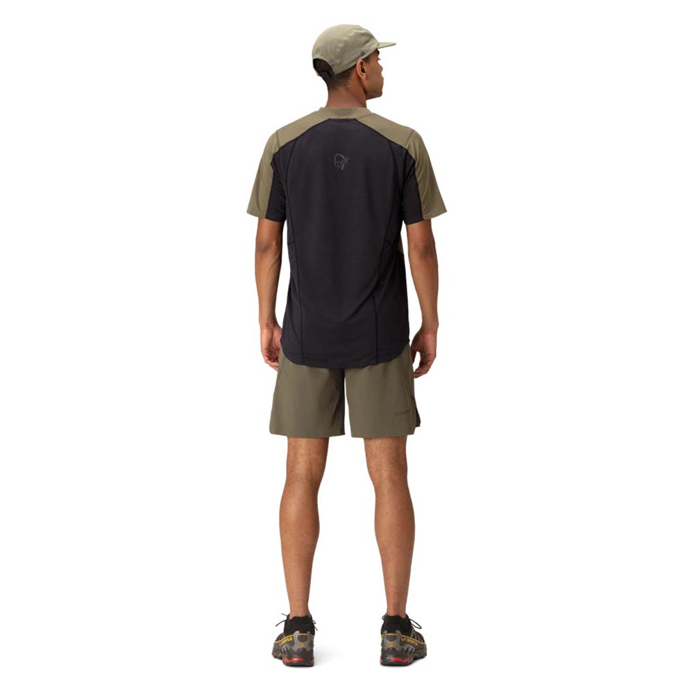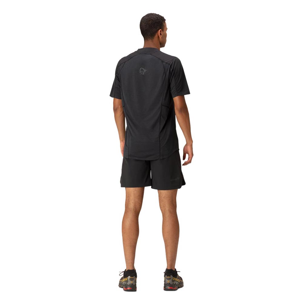 軽量で速乾性に優れたTシャツです。トレイルランニング用にデザインされていますが、柔らかさ、軽量性、吸湿性、速乾性を必要とするあらゆるアクティビティに対応します。メイン素材は、吸水速乾加工が施された100%リサイクルポリエステル(91g/m2、UPF45+)、Teijin Deltapeakを用い、肩・上前に使用しています。別素材は、100%リサイクル・ポリエステル(103g/m2、UPF15+)のダブルニットで、HeiQ Fresh FFLという銀を含まない防臭加工が施されており、汗に含まれる脂肪やタンパク質を除去することで細菌の増殖能力をなくし、臭いを軽減します。この生地は脇の下にも配されている為、防臭効果が高く、洗濯が必要になるまで何度でも使用することができます。