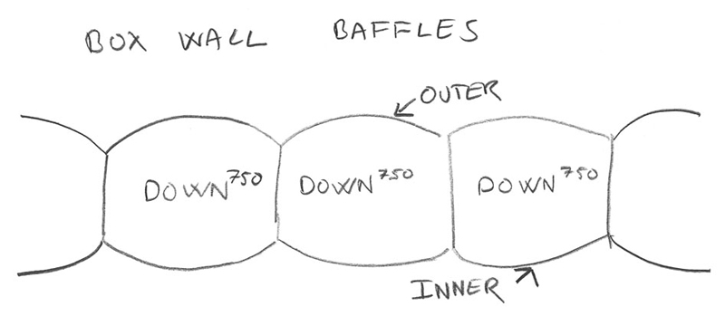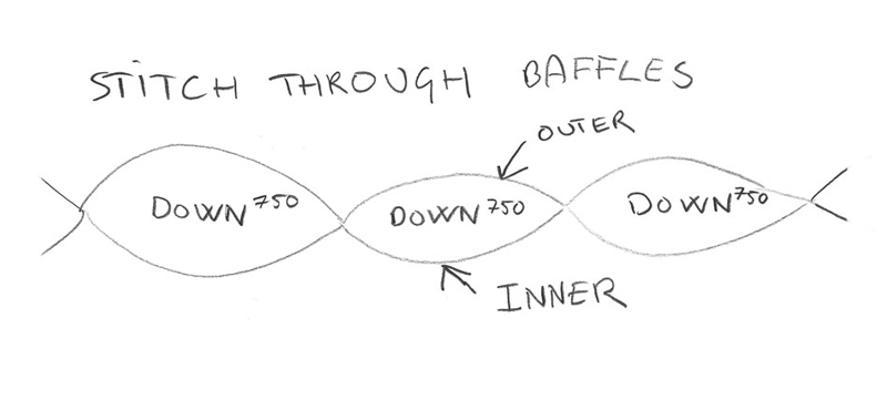 バッフル構造では、2つのタイプがあります。1つ目は、外側表面から裏地に貫通する縫い目があり、この縫い目がつくるスペースにダウンが収納できる構造で「縫い目貫通」タイプです。このシンプルな構造は、ほとんどの軽量ダウンジャケットに使われていますが、さらに進化したボックスウォール構造よりも保温性で劣ります。