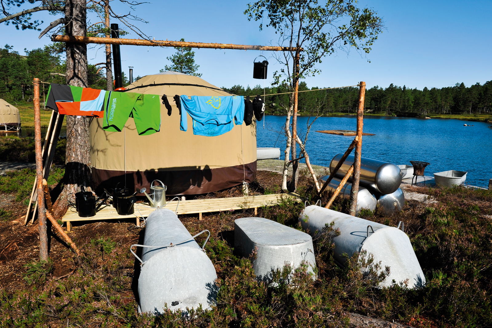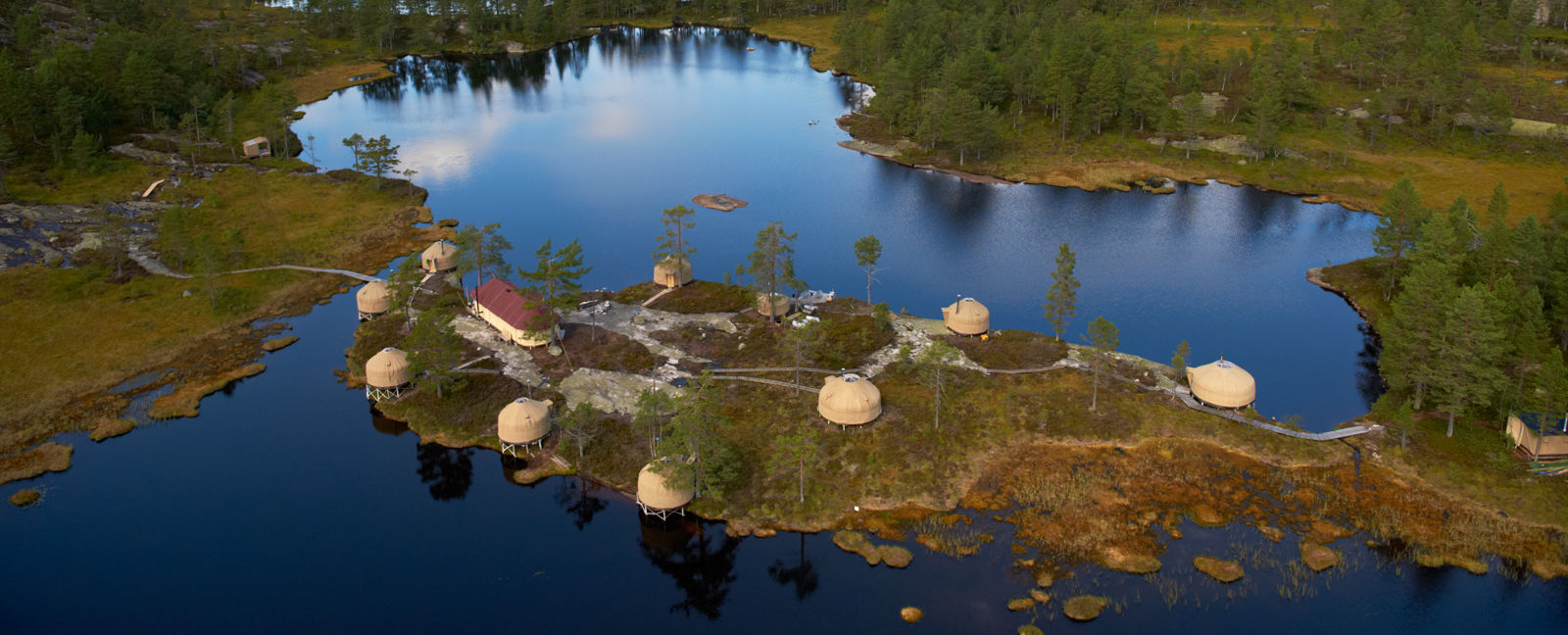 少し離れたところから見ると、キャンバスホテルはネイティブアメリカンのキャンプを思い起こされます。そのキャンプは典型的なモンゴルのパオのように特別にデザインされた、まるで景色にとけ込むドットのような、カーキ色の厚いキャンバス生地で作られたテントでできています。この小さな島のどちらからもつながる小さな橋の先には無数のトレイルがあります。いろいろな種類の、今まで食べたことのないような最高の食事がサーブされるキッチンテント、ほとんどブラックウォーターとなっている池でのスイミング、サウナ、そしてパオでできた素晴らしい寝室に魅了されます。