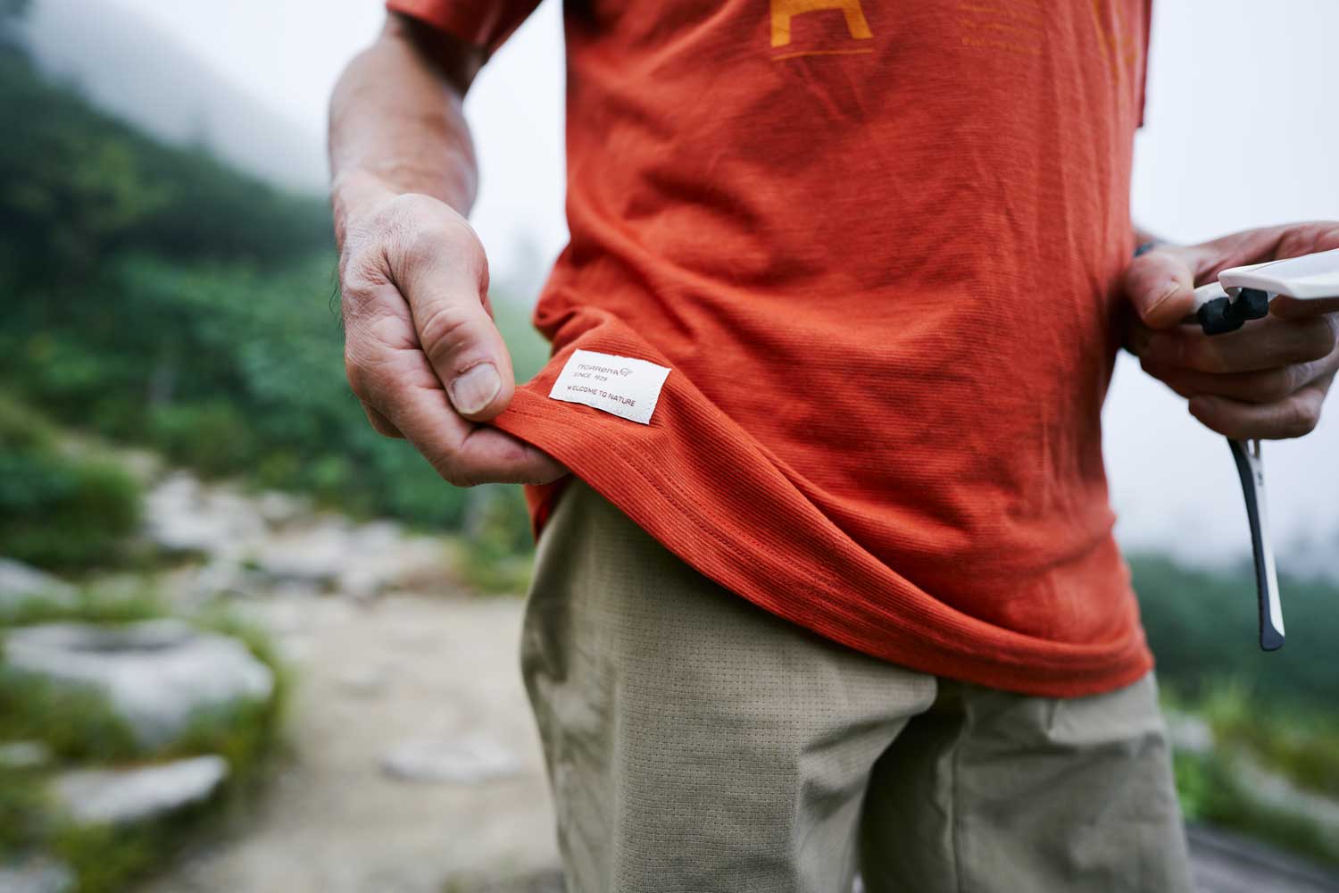 これもメリノウールとポリエステルのTシャツですが、ポリエステルっぽい肌触りですね(メリノウール47%+ポリエステル53%)。僕的には家からアプローチまではこれ。たとえば、北アルプスの穂高に行くなら、家を出てから横尾や涸沢まではこれでいいと思います。暑いところだから、汗をかいても冷えませんしね。