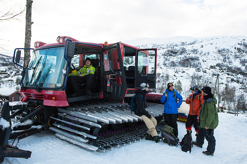 その次の日、今度はマグナスがエヴァンとクリスティン、アンドレアスの雪上でのスキルを目の当たりにする番だった。我々はノルウェー中に広がる無数の小さな、あまり知られていないスキーエリアのひとつHarpefossenに向かった。広大で無限の可能性があるこのエリアを見つけ、マッズは国内で初めてのキャットスキー事業をここで始めたのである。ラッキーなことに我々はその最初の客としてこのキャットに乗り込むことができた。駐車場にいる時点で、何故マッズがこの場所に決めたのかがよくわかった。いま雪はいいかもしれないけど、コンディションの変わりやすい西海岸のこの位置は波をキャッチするにもパウダーを楽しむにも最高で、むしろここにいるべきなのだと思わずにはいられないような場所であった。
