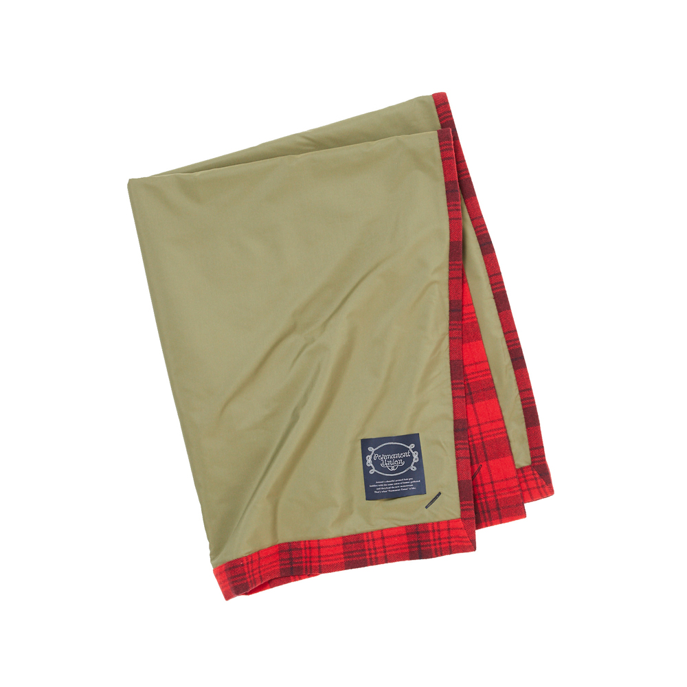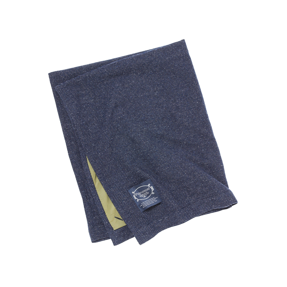 表地は毛七(ウール70%化繊30%)、でシャツに使用している生地と同じです。裏地に撥水加工を施したポロエステル82% コットン18%を使うことで火に強く、雪や雨から守り、グランドシートにも出来るブランケットです。4つ角に穴を開けちょっとした緊急時のタープにもできます。