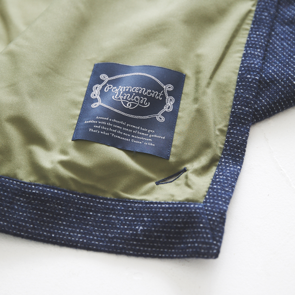 ウールの産地、尾州が生み出すリサイクル技術「羊毛再生」古着を集め、ウール を取り出し糸にする。そこから生まれた生地を使用したリユース素材。生地の表裏を強起毛させたブランケットです。