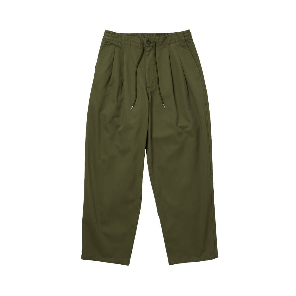 ウエスト後ろ側にゴム紐を使用する事でベルトをしなくても落ちることがない仕様。ビブパンツより少し細めのシルエットは綺麗な印象を醸し出す。