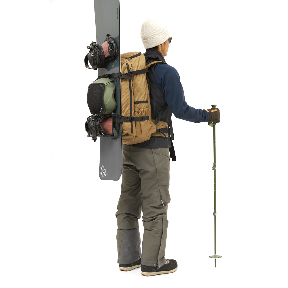 アバランチギアはスノーボートやスノーシューを装着したままでも素早くアクセス出来るようにサイドに開口部を作り、金属類が干渉しないよう全て独立した専用のコンパートメントになっています。