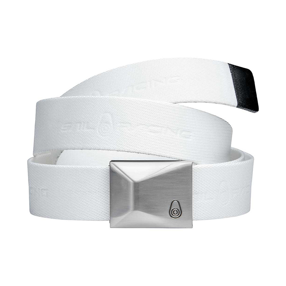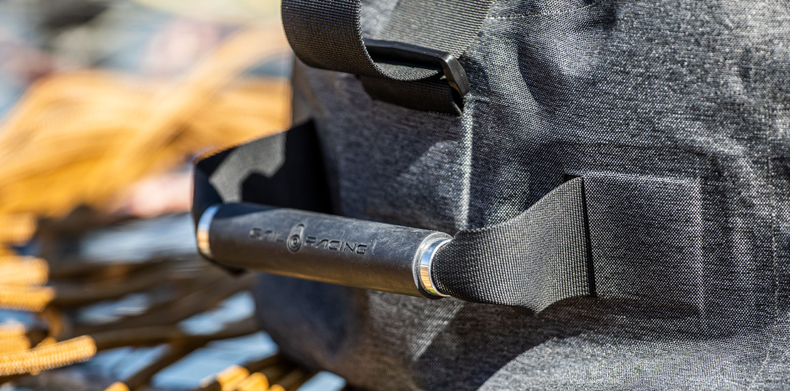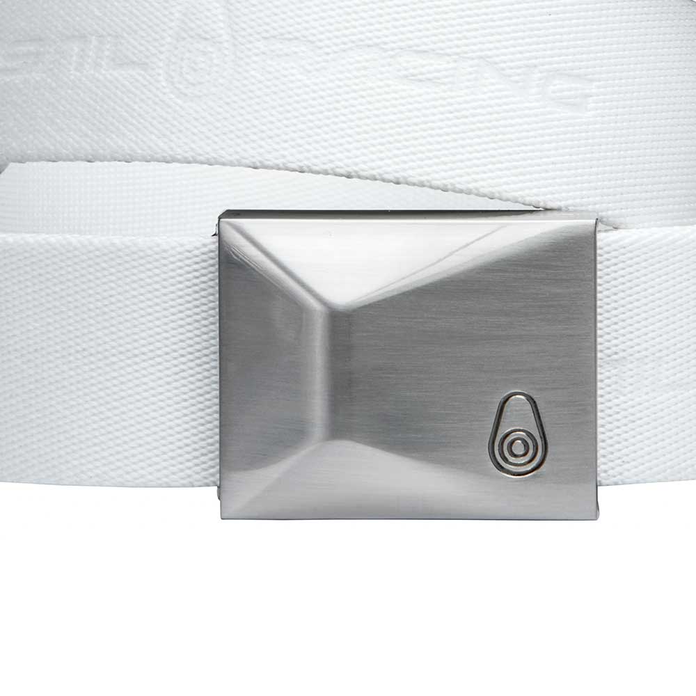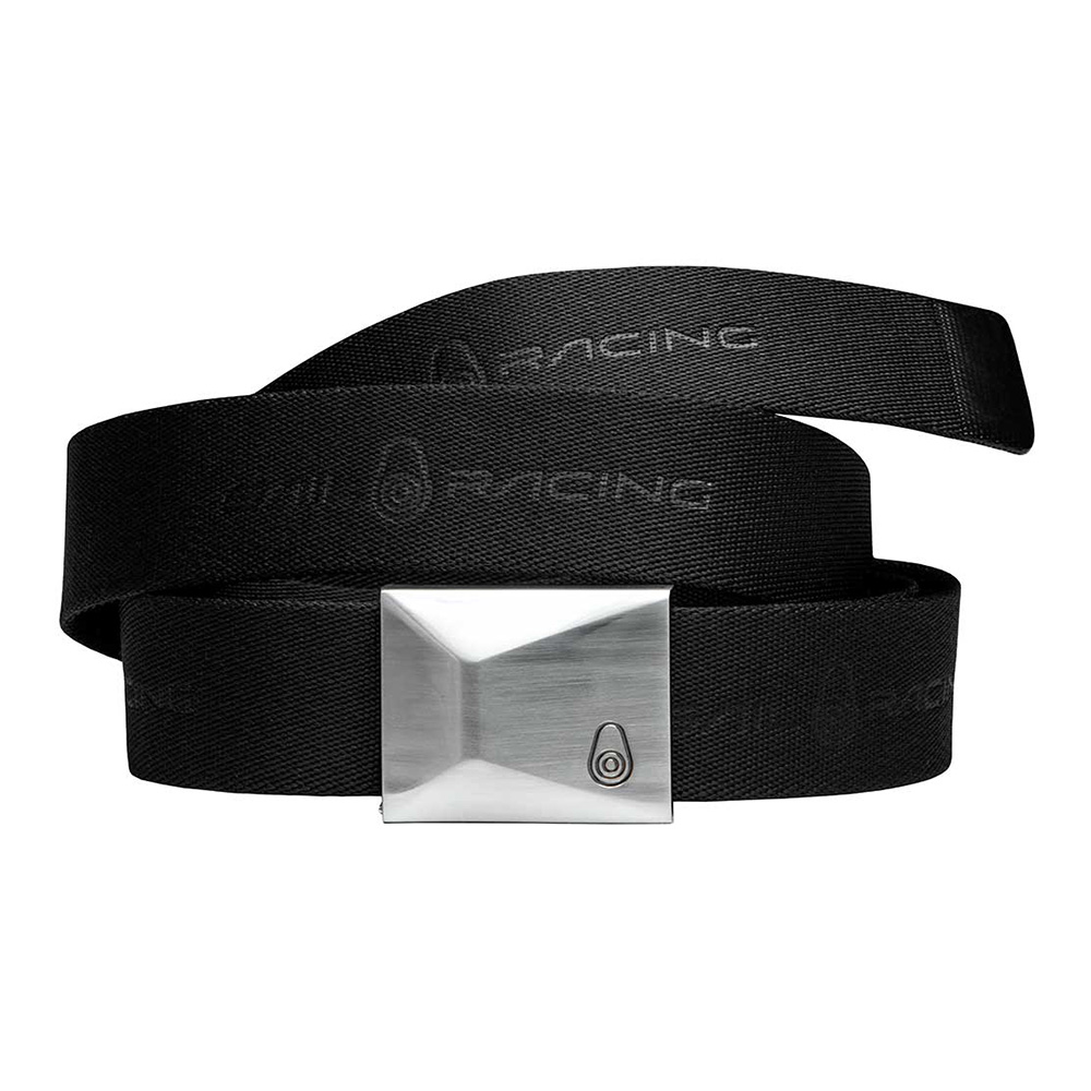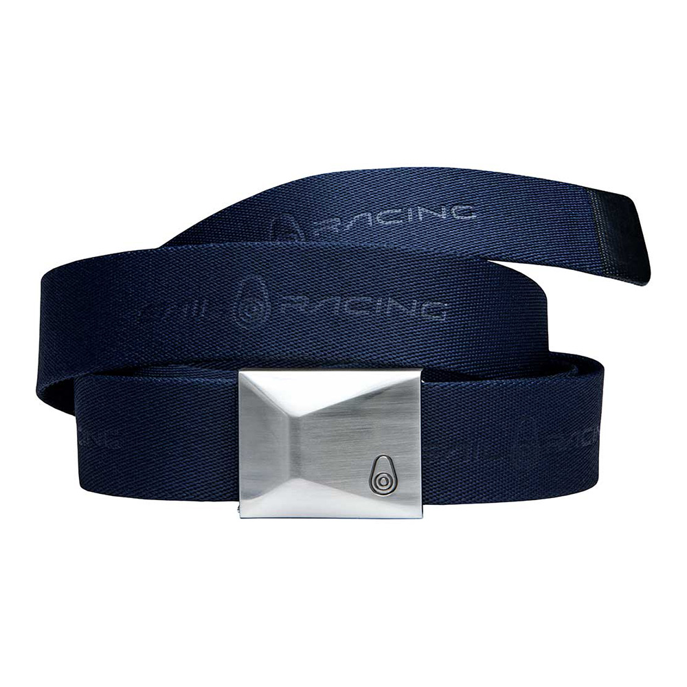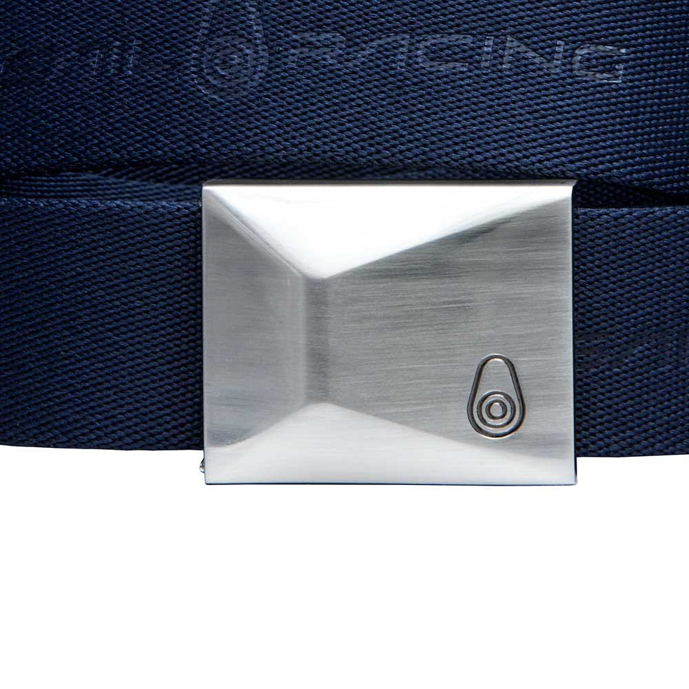 100%ポリエステル素材のベルト。金属製のバックルにSailRacingのブロックロゴが刻印され、ベルトにSailRacingのロゴを並べています。