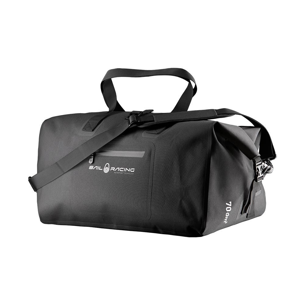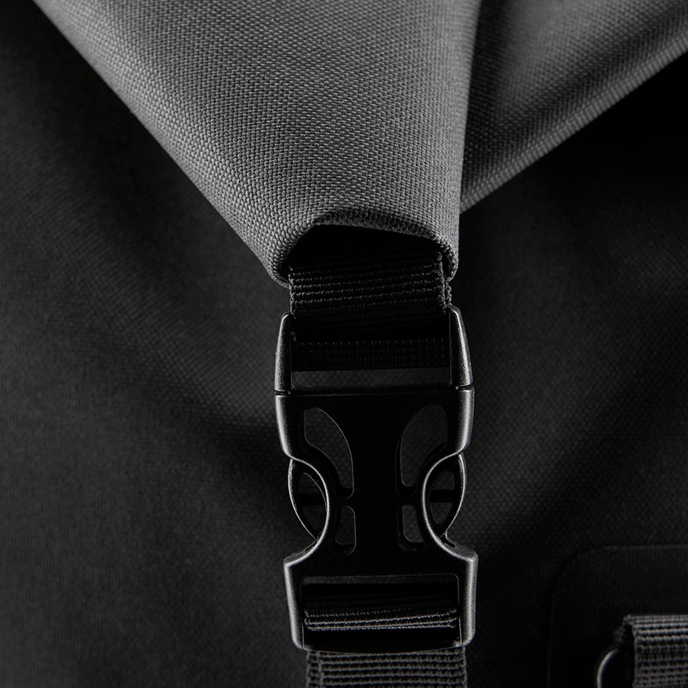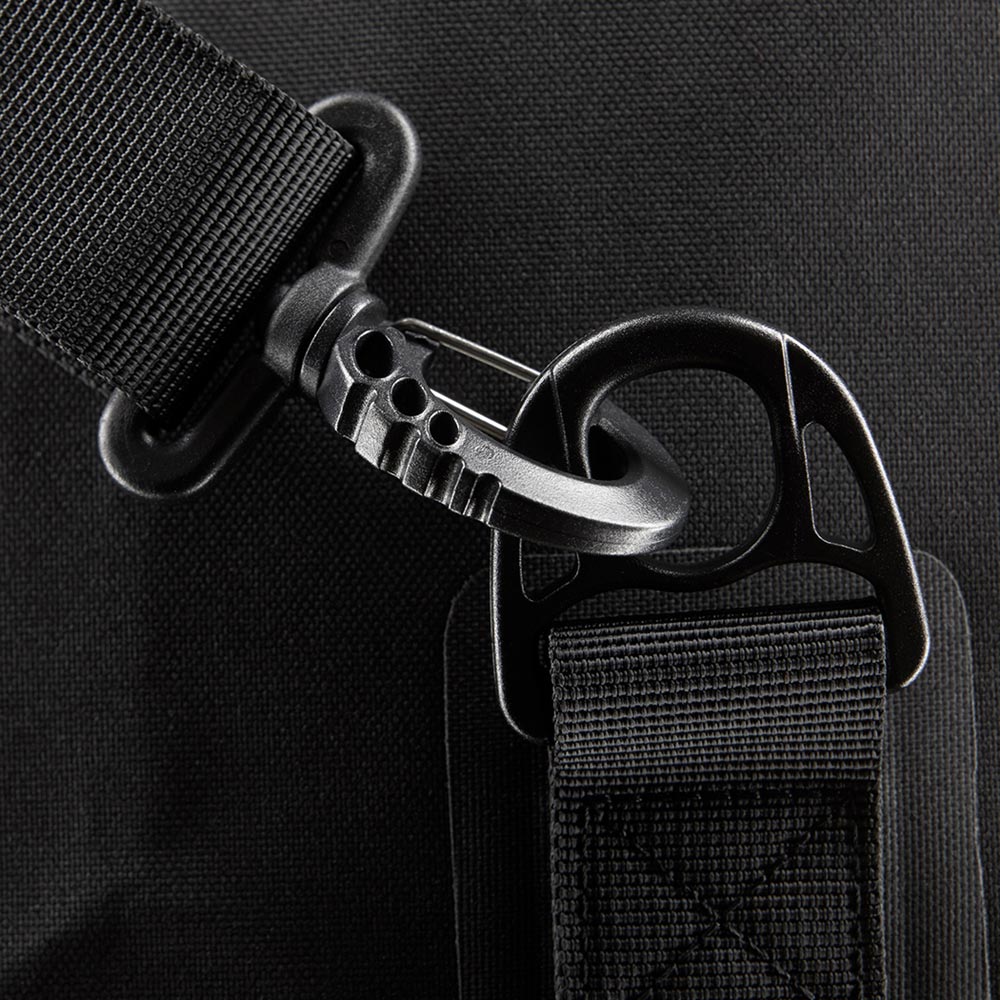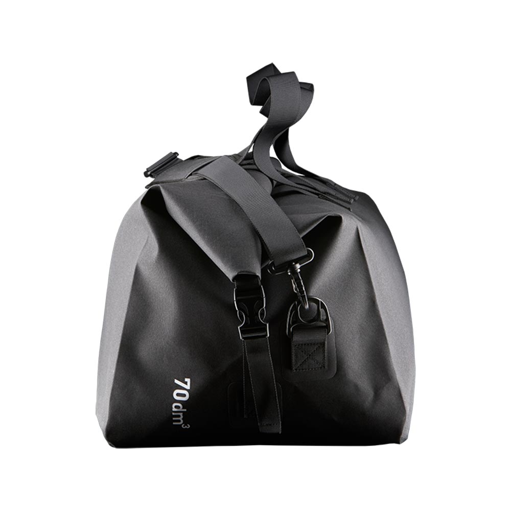 防水素材で作られたこのバックは大きな開口で荷室にアクセスでき、閉口は巻き込みと上部と両サイドのをクリップで行います。ショルダーストラップはパッドが施され長さの調節ができます。メッシュの大きなインナーポケットあり。外側のジッパー付のポケット下にロゴが入ります。上部にハンドルあり。側面に『40dm3』のプリント。