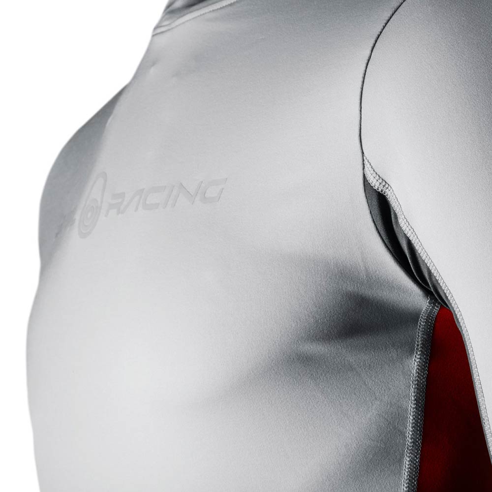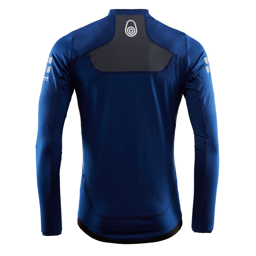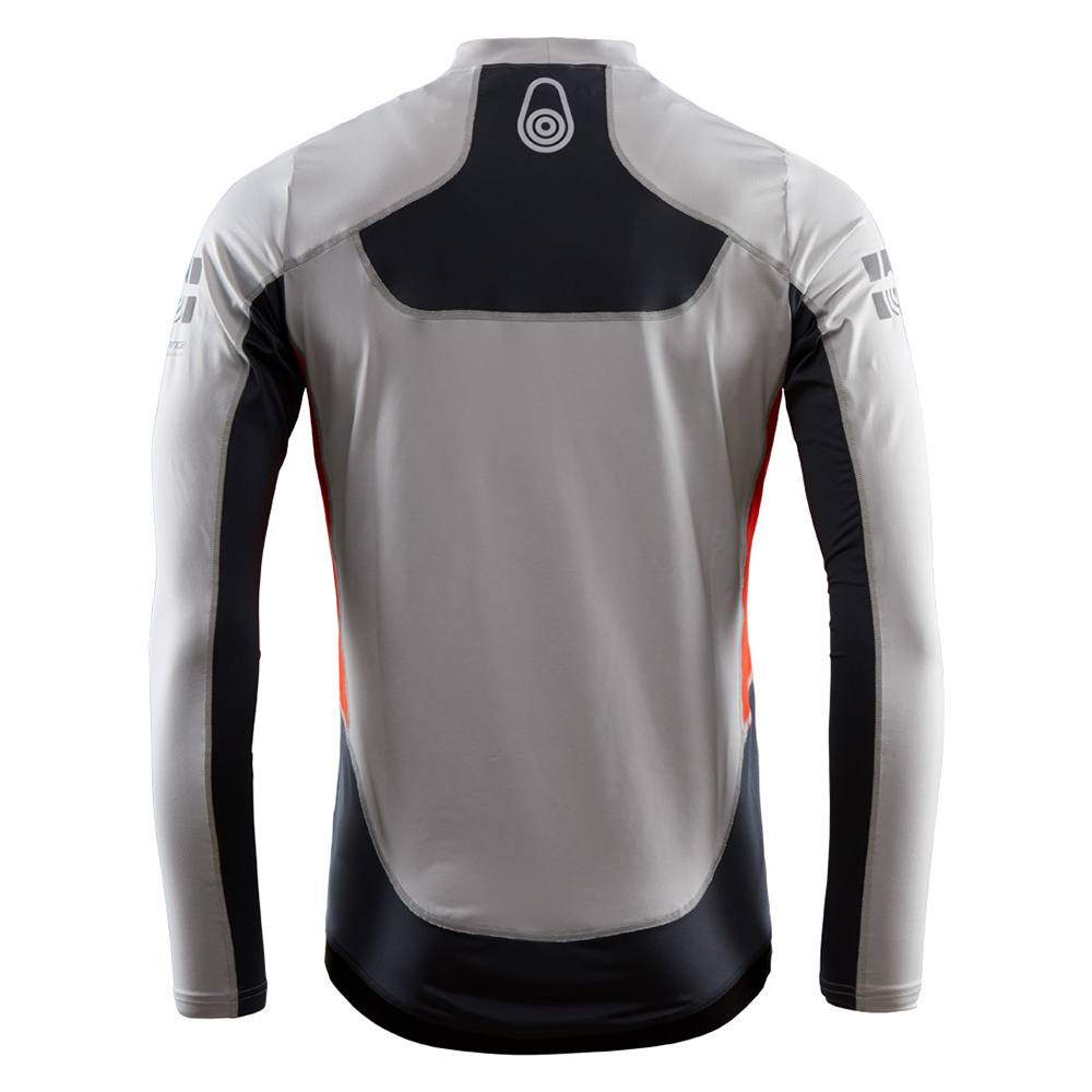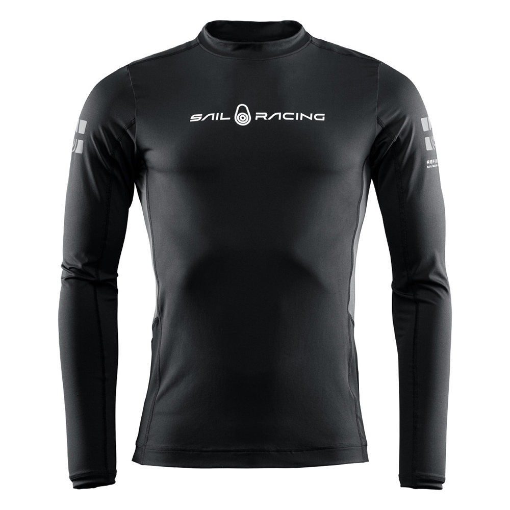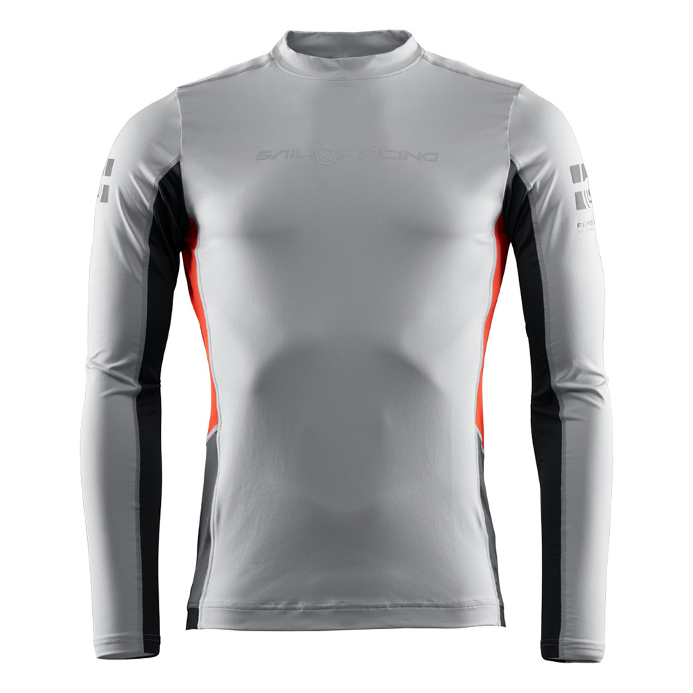 速乾ストレッチのポリアミド生地で作られた長袖ラッシュガード。裾の内側にズレ防止用テープ。肩にリフレクタープリント、胸と背中にはSail Racingのロゴ。