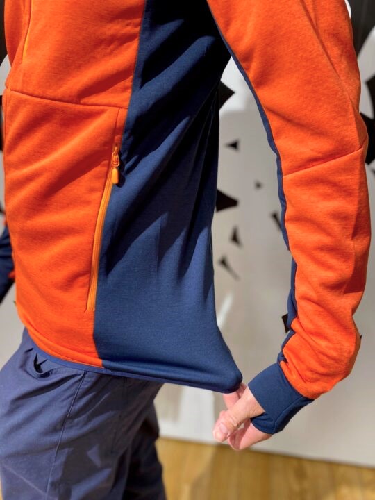 脇下~袖下、背面はニット状の薄手フリース地のみとし、伸縮性と通気性が抜群で非常に動きやすく、効率的に熱を逃がしてくれます。