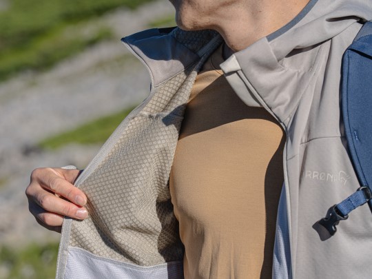 Octaは写真のように格子状となっており、素材単体での使用というよりは、同じNORRONAの『 falketind Octa Jacket 』のように、一般的には表地(外側)のウィンドシェルなどと組み合わせて使われる素材です。