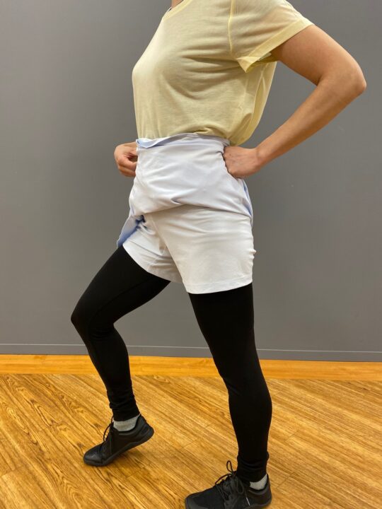 よく伸びる生地と巻きスカート構造のおかげでかなり足が開きやすいです。