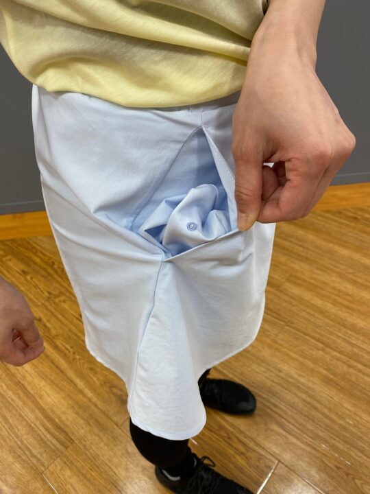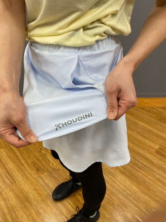 一分丈ショーツの上にスカートが巻いてある二重構造で、以前は中と外の素材が違いましたが、今回HOUDINIの人気素材Wish Woven™に統一されました。耐久性、防風性が増し、山や海での紫外線にもより強くなりました。