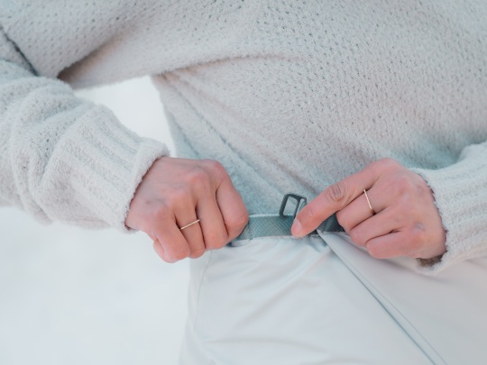 ウェストの両端に付いた2つのフックを、ウェストに周りに張り巡らされたループに差し込んでサイズ調整します。