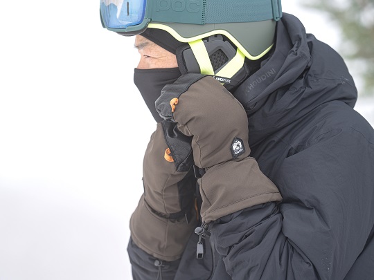 このモデルに代表される、親指と人差し指を独立させた3-FINGERタイプが暖かく人気ですが、これらのグローブでも寒い、もしくは寒さに弱い方にまずお勧めしたいのが、今回のミトングローブになります。