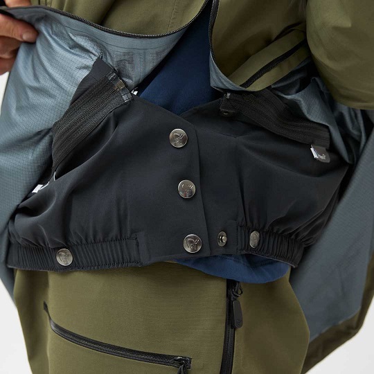 ジャケット内側のウェストには、雪の侵入を防げる脱着可能なパウダースカートを装備。