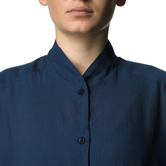 首元は低めのスタンドカラーですが、ボタンを開けてカラー(襟)を折ってみても、また違った雰囲気で着こなせます。