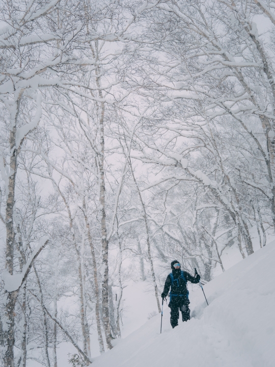 <バックカントリーは自分の足で一歩一歩山を登って、極上のノートラックパウダースノーを堪能したり壮大な景色を眺めたりと、いわば究極の自己満。その反面過酷な自然環境に身を置くため、危険と隣り合わせということも常に念頭に>