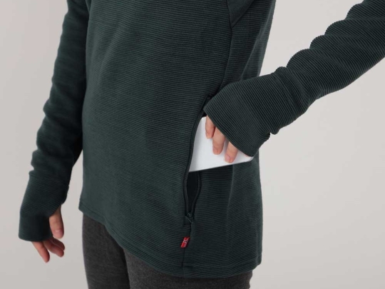 ザックを背負ったり、レイヤリングで摩擦の起こりやすい肩口には、フラットなWARMWOOLの生地を2層構造で用いて摩擦係数を減らし、脇下を中心とした熱のこもりやすい部分には、WARMWOOLを1層で使用することで通気性(透湿性)を確保するなど、快適性の追求にも余念がありません。