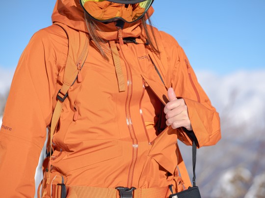 左胸にもうひとつ付いたジップはベンチレーションとしてだけではなく、緊急時にはビーコンへ直接アクセスできたり、ミッドレイヤーのポケットに収納したスマホを取り出すことができ、とっても便利。