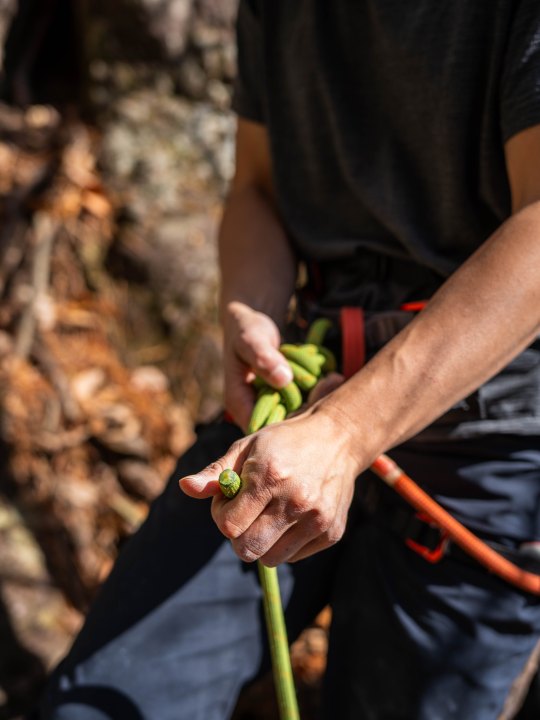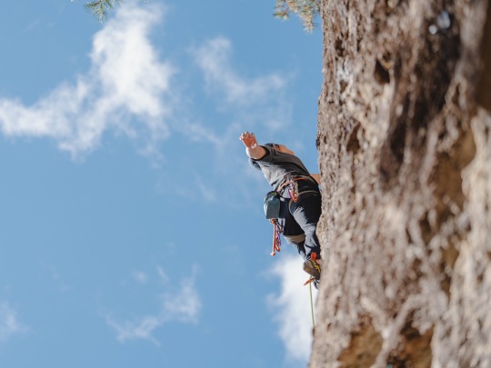 登り進めていくとボルトが打ってあるので、そこにクイックドロー、その次にロープをかけてさらに上へと登り進めていきます。そうすることでクライマーが落ちてしまっても最小限の落下で食い止めることができるのです。