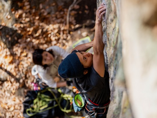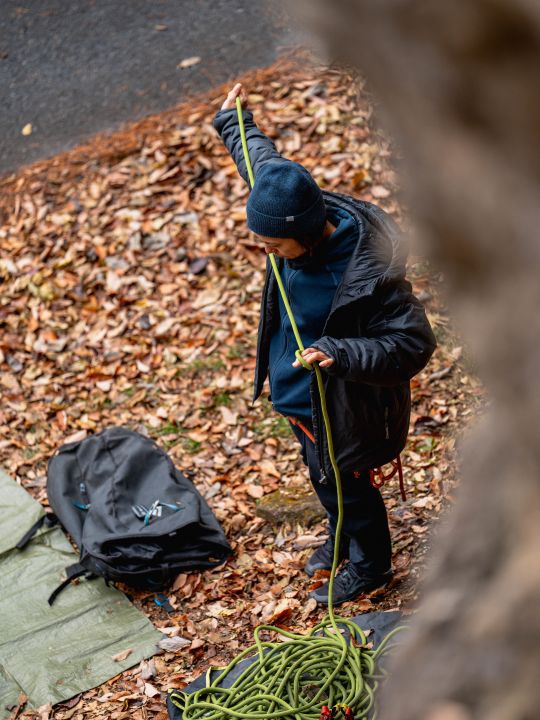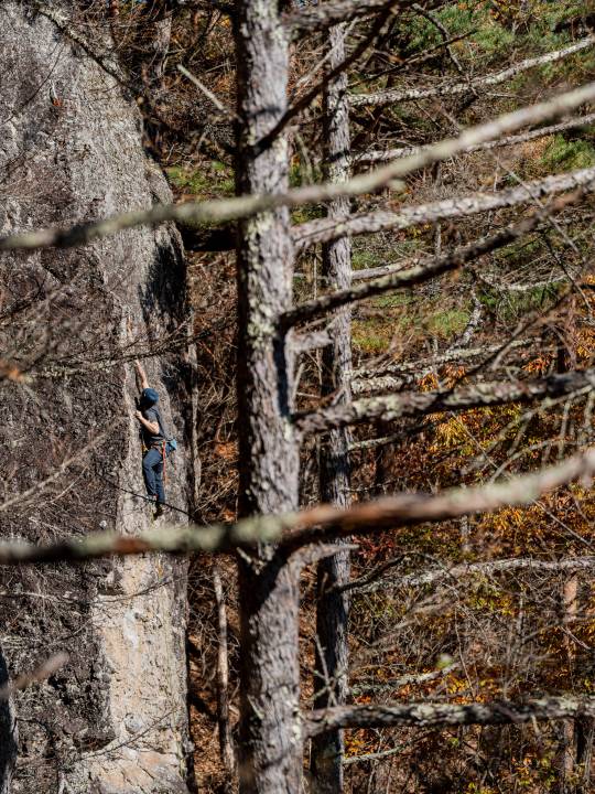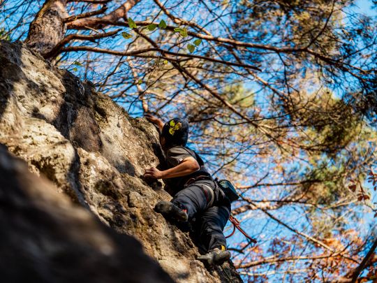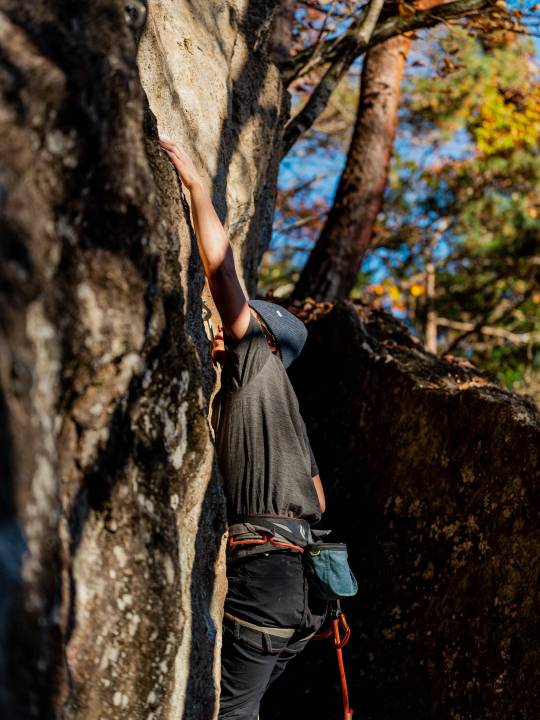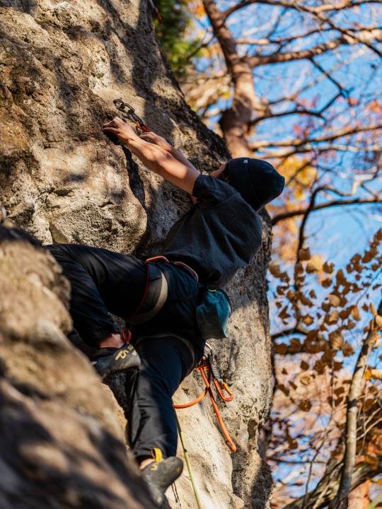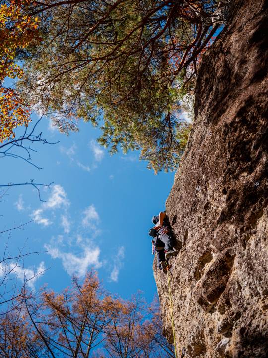 岩場ではロープによる安全確保をしながら大きな岩壁を登るスポートクライミングをメインに行っていますが、時には3~5メートルの岩をロープなしでマットをひいて登るボルダリングをすることもあります。