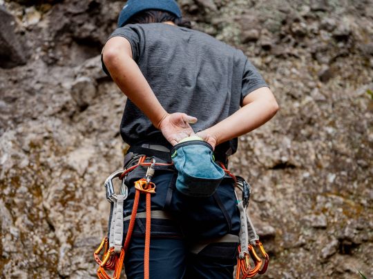 軽い準備運動をしてからハーネスを履き、クイックドロー(カラビナという支点確保の道具)を装備し、ロープをハーネスに結び、クライミングシューズに履き替えます。